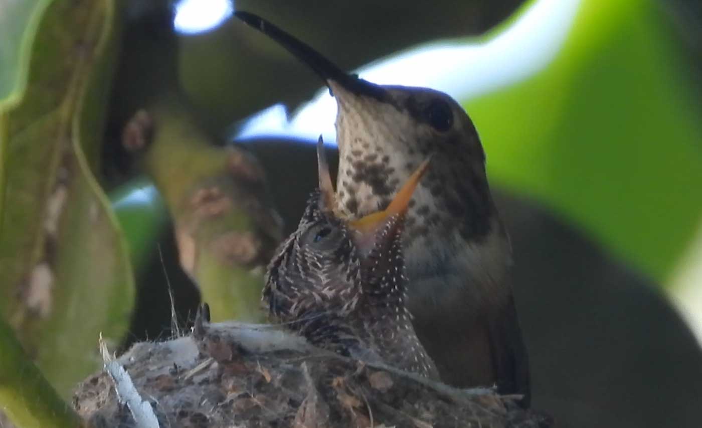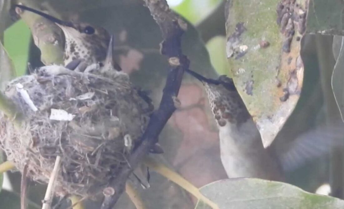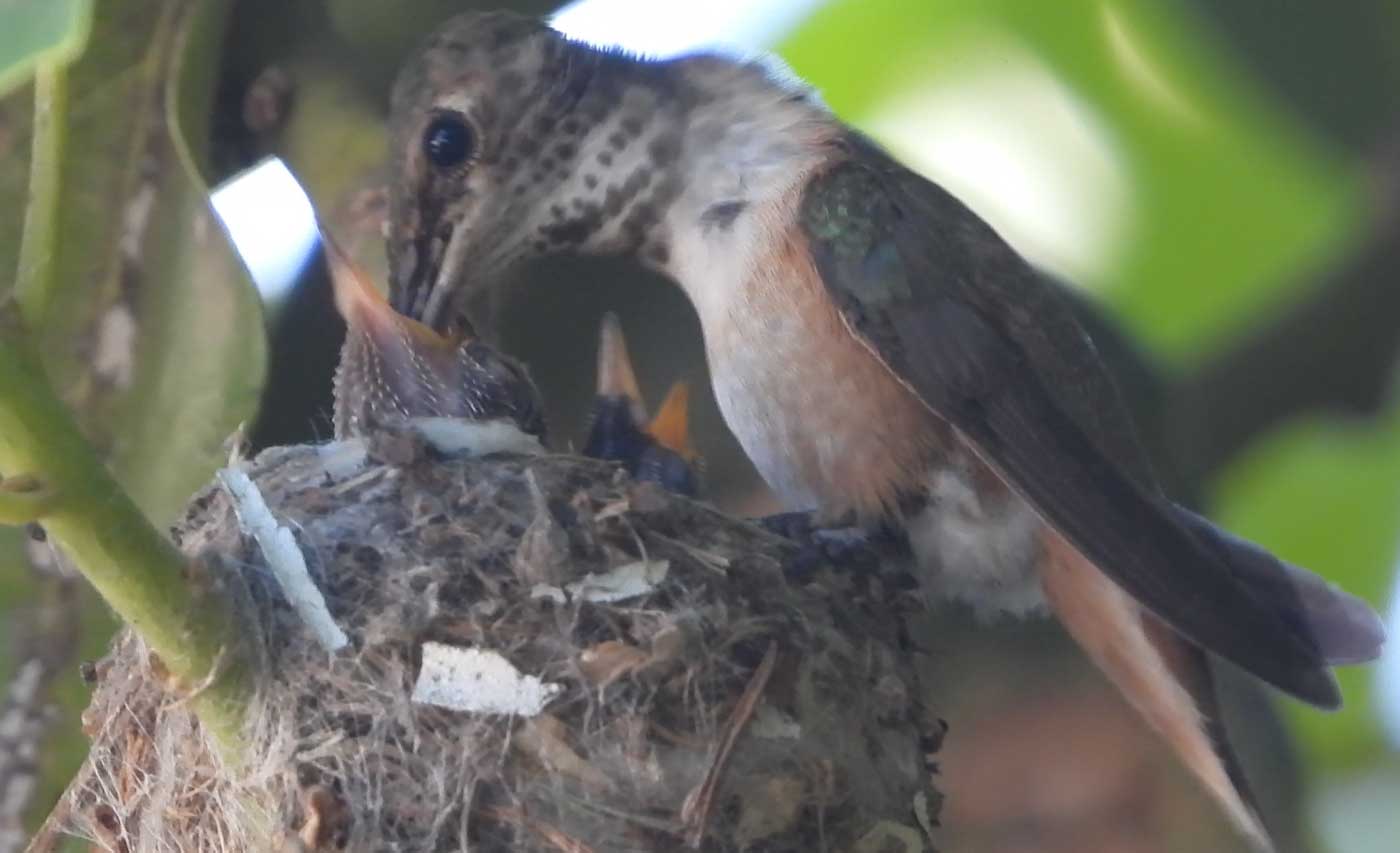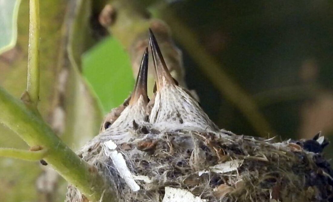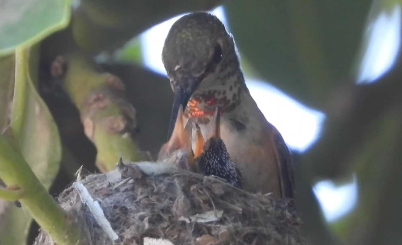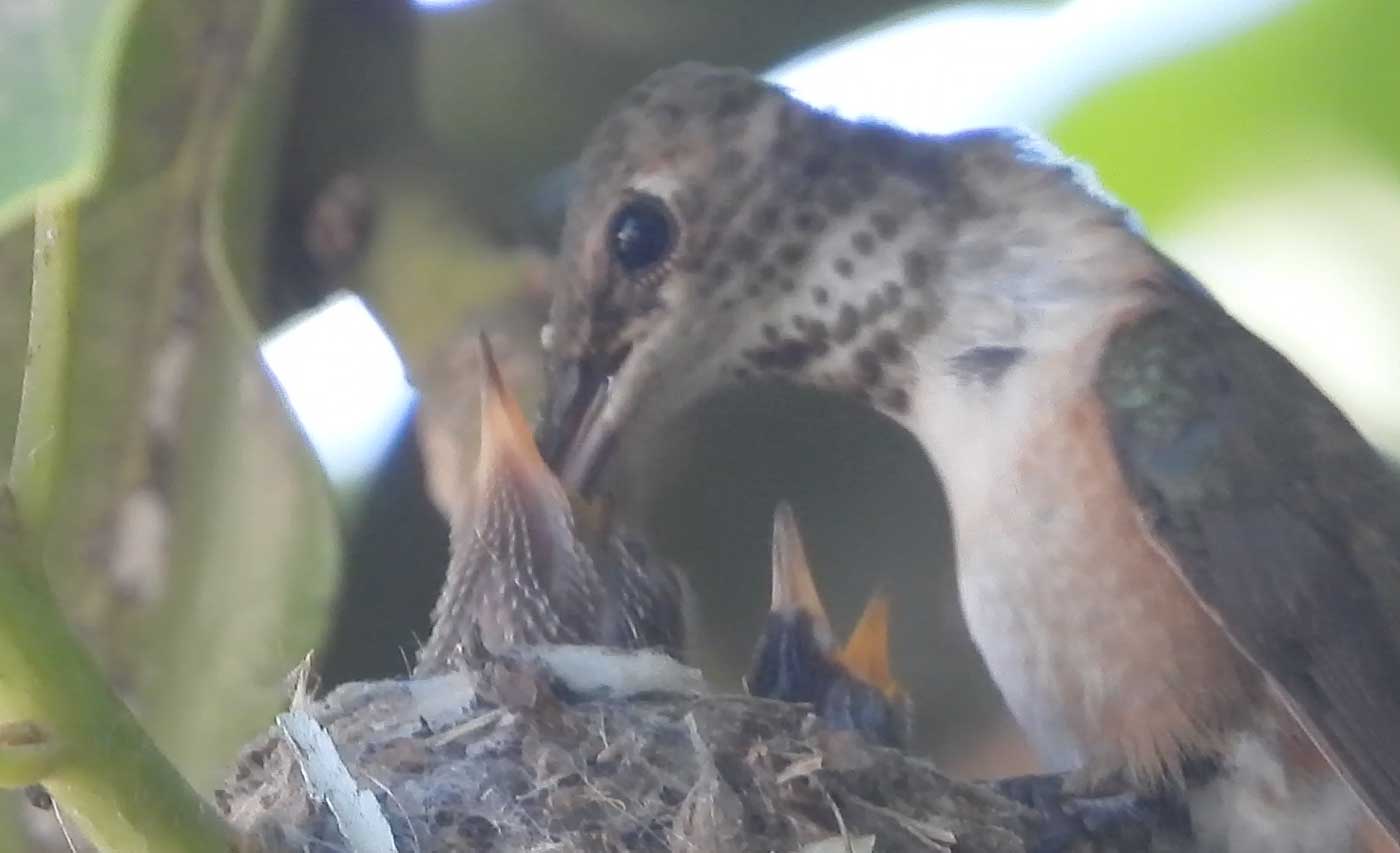 She’s come back to the same tree now for the third time this year. Today (June 1st)she is feeding her two newborns which are a day old. Their beaks are still white and they’re hairless. She successfully raised two fledglings that live near by and frequent the nectar here.