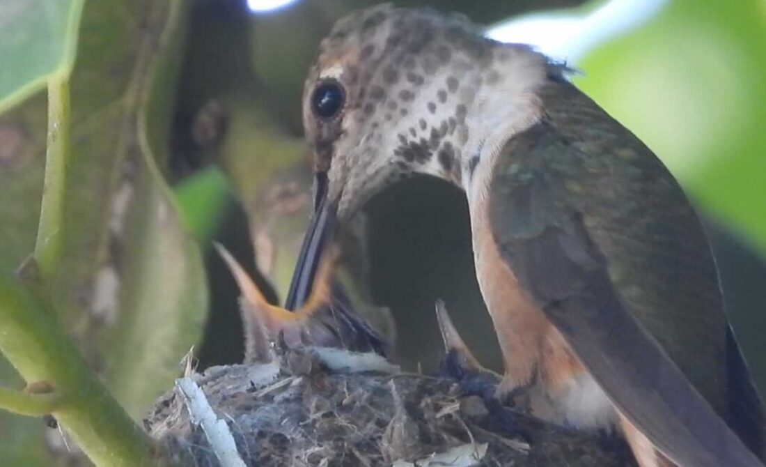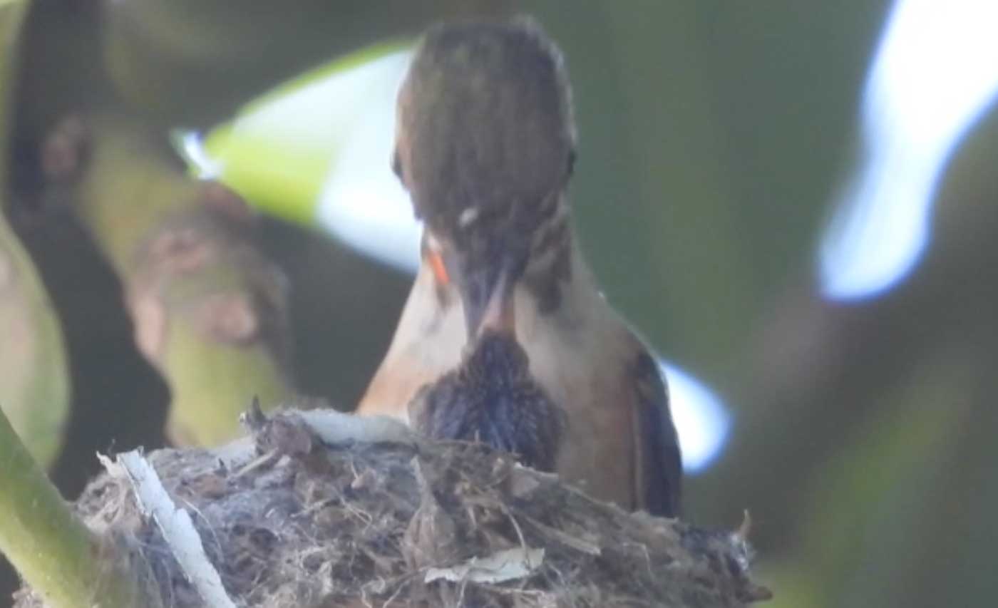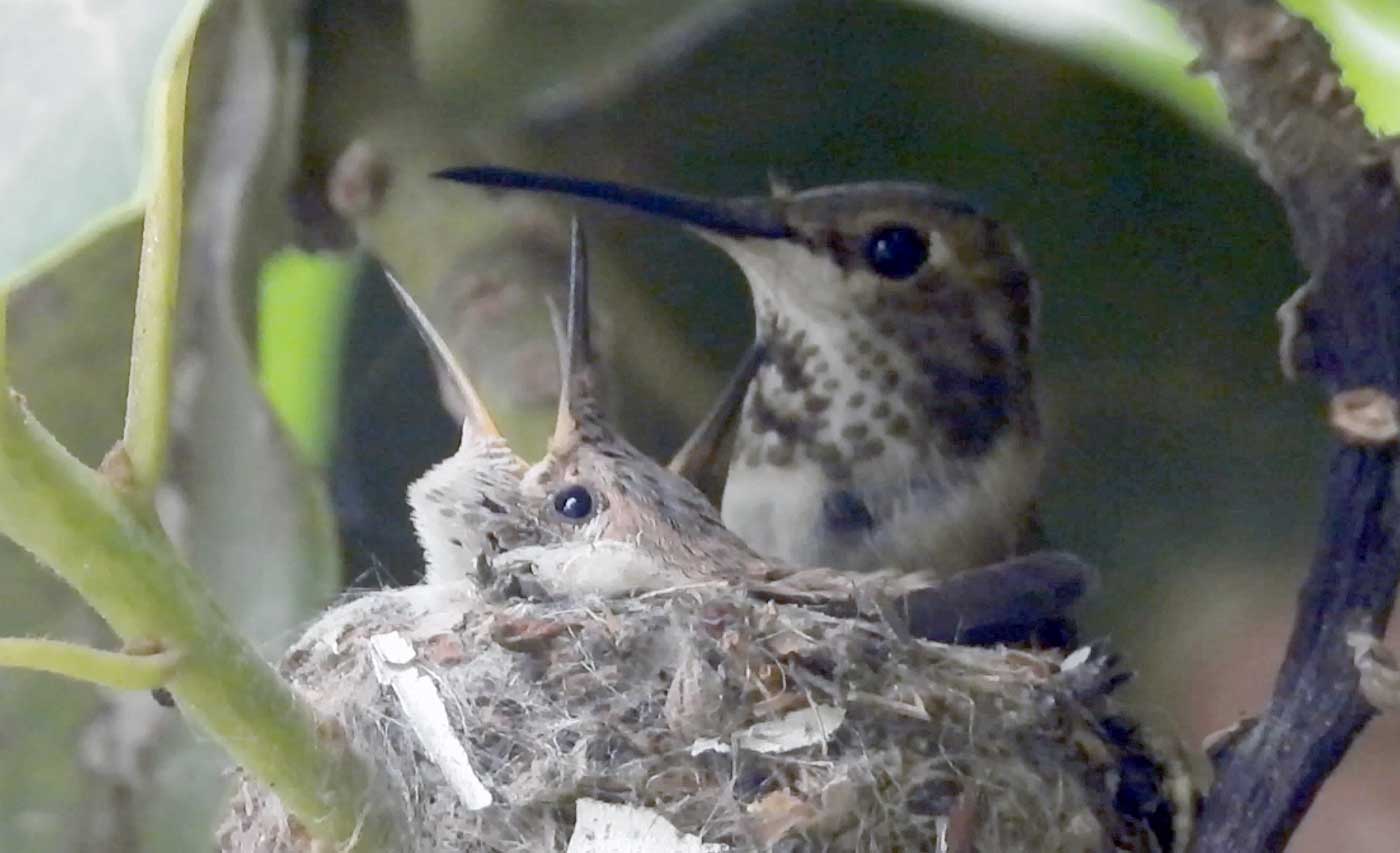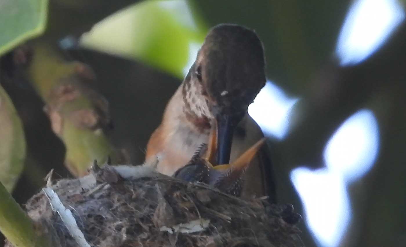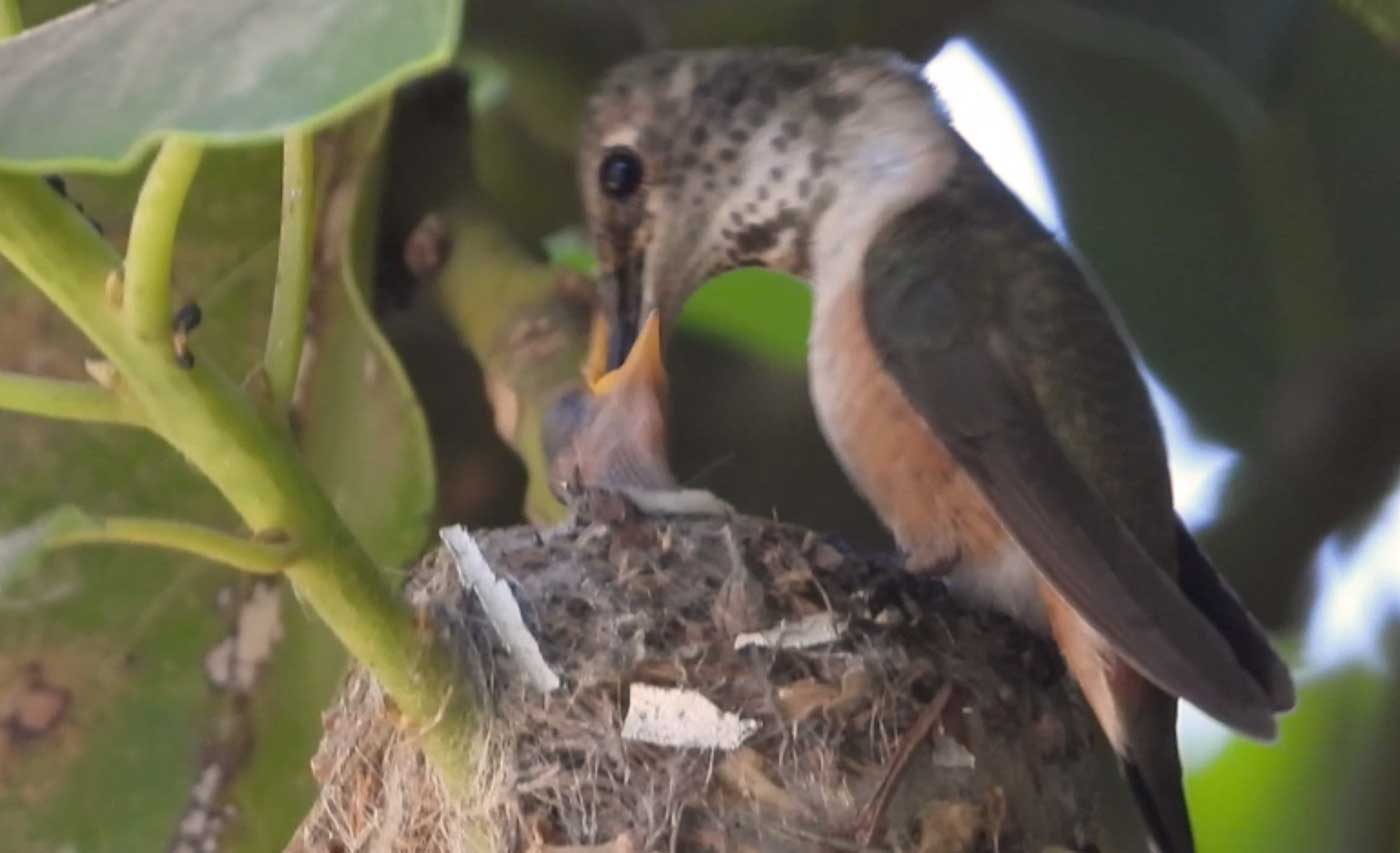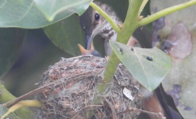 She’s come back to the same tree now for the third time this year. Today (June 1st)she is feeding her two newborns which are a day old. Their beaks are still white and they’re hairless. She successfully raised two fledglings that live near by and frequent the nectar here.