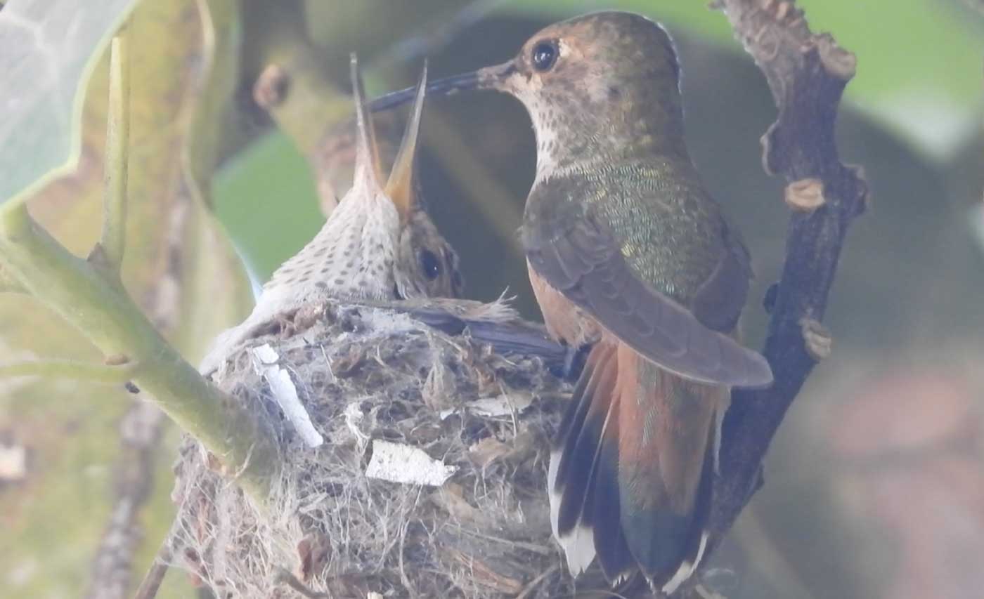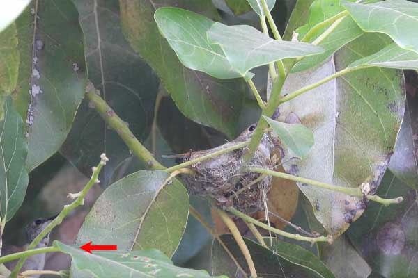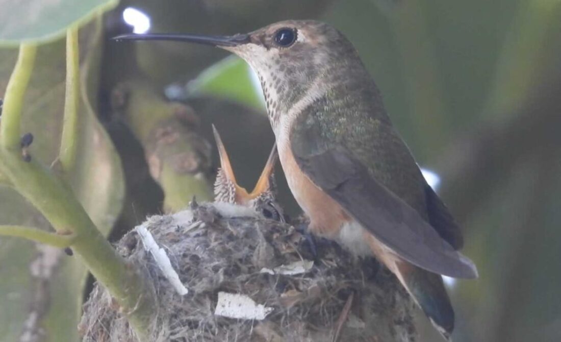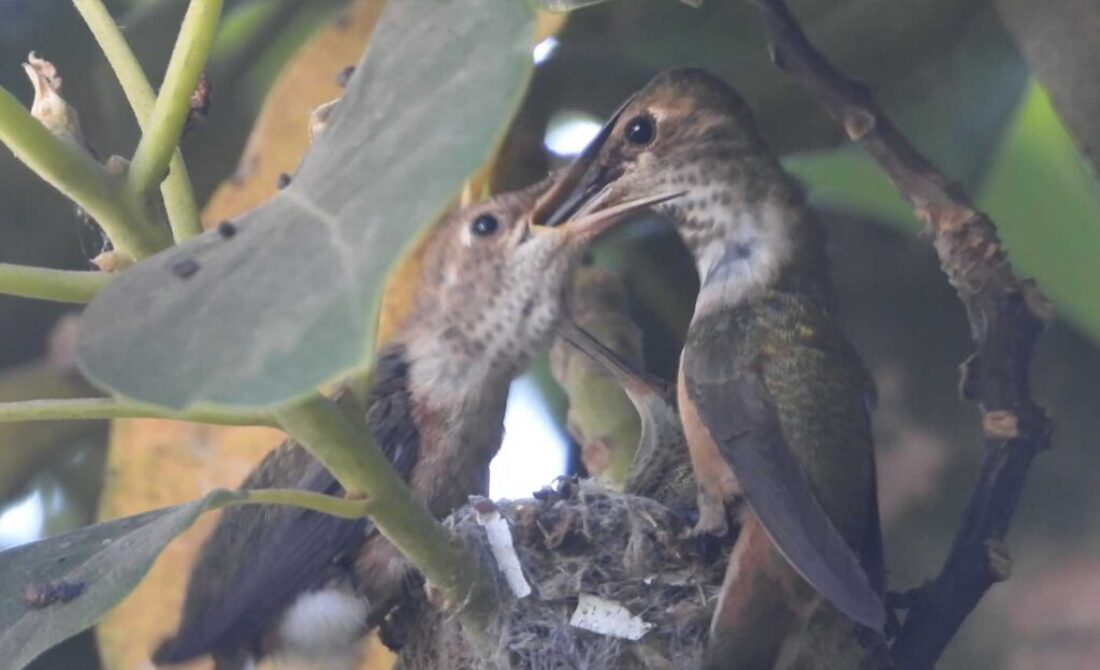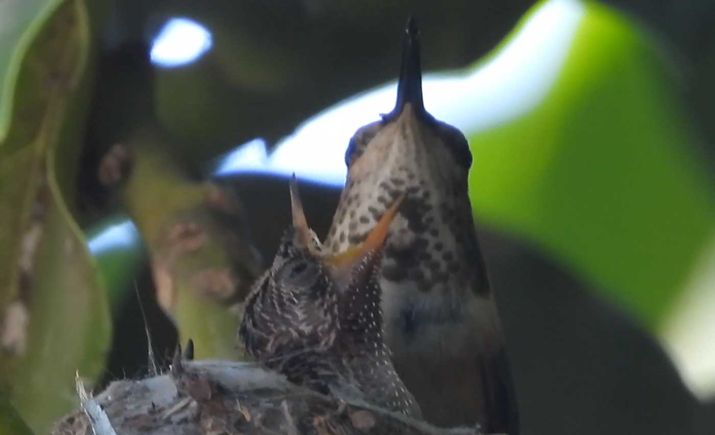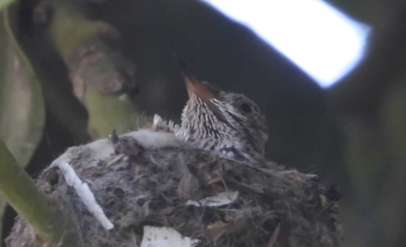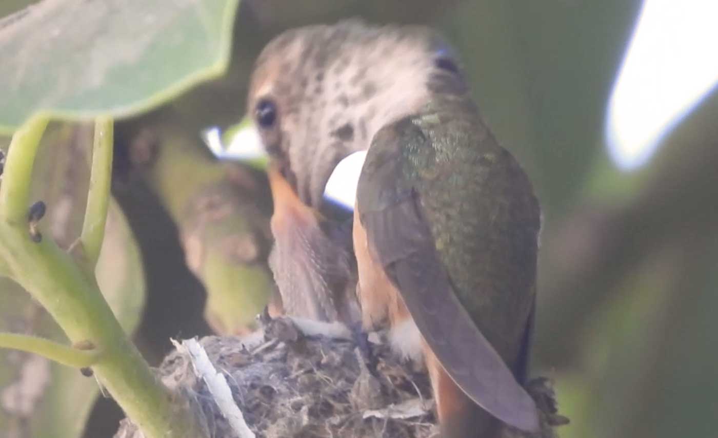 She’s come back to the same tree now for the third time this year. Today (June 1st)she is feeding her two newborns which are a day old. Their beaks are still white and they’re hairless. She successfully raised two fledglings that live near by and frequent the nectar here.