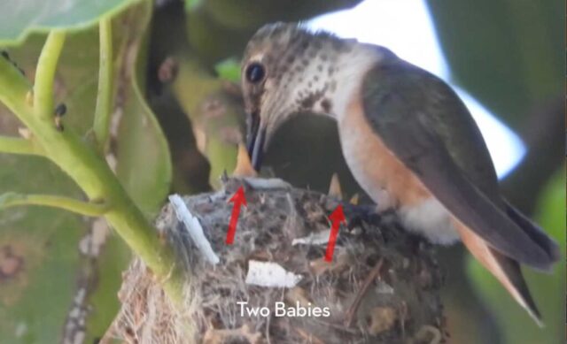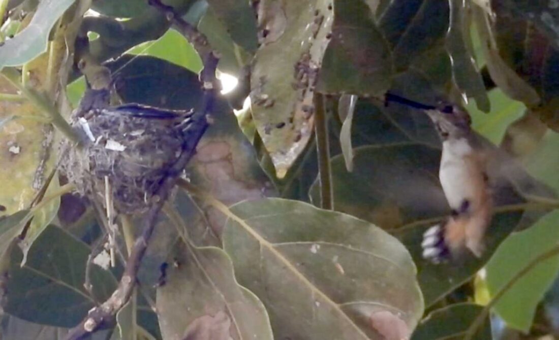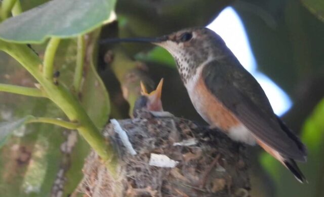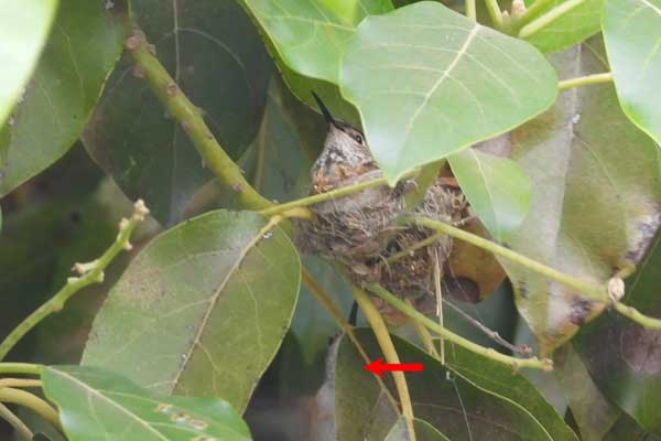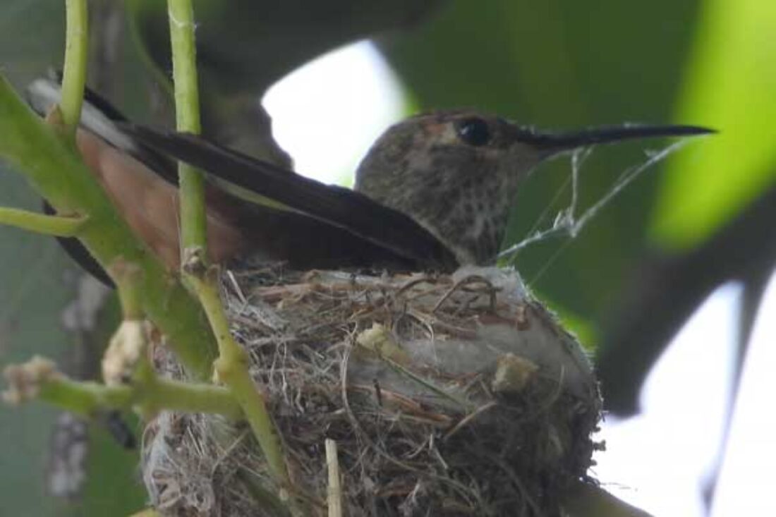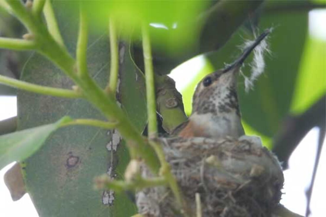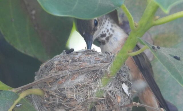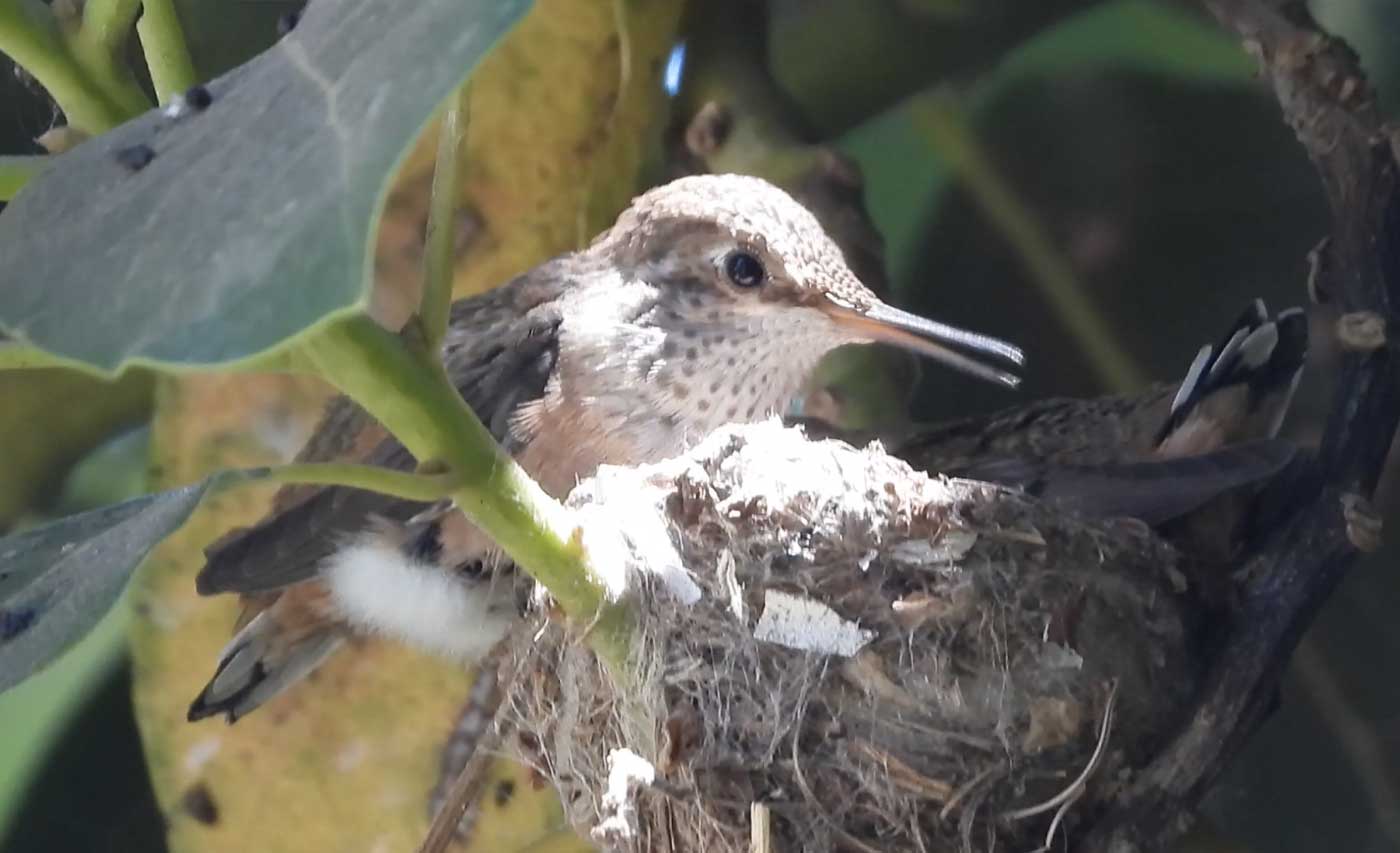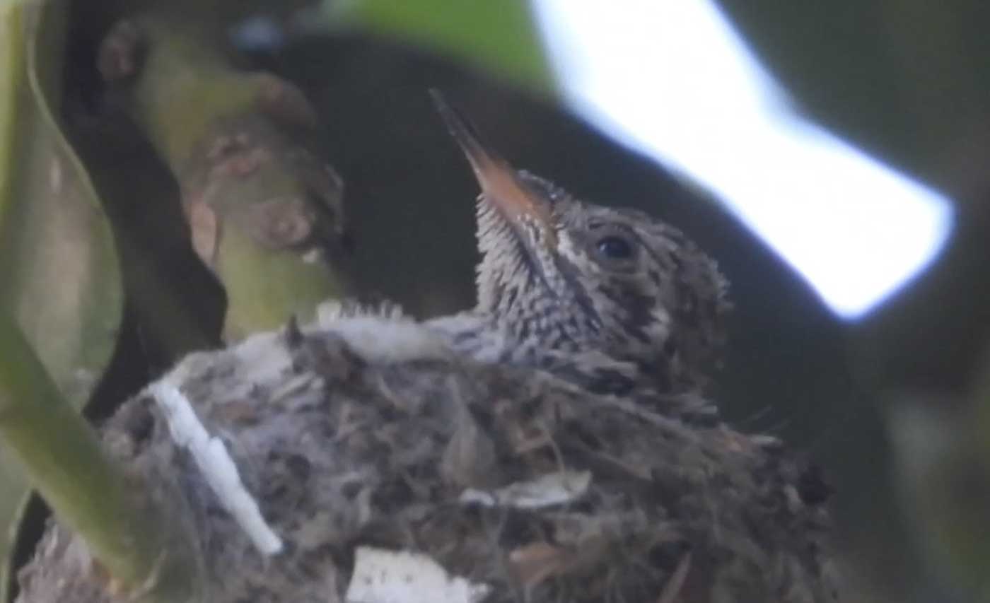 She’s come back to the same tree now for the third time this year. Today (June 1st)she is feeding her two newborns which are a day old. Their beaks are still white and they’re hairless. She successfully raised two fledglings that live near by and frequent the nectar here.