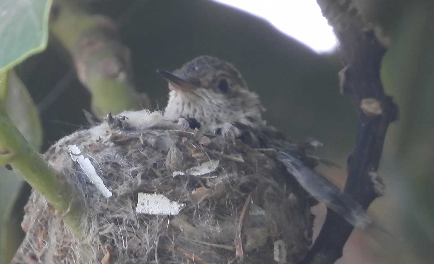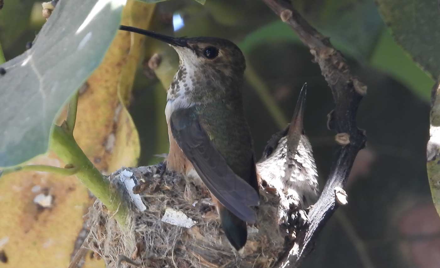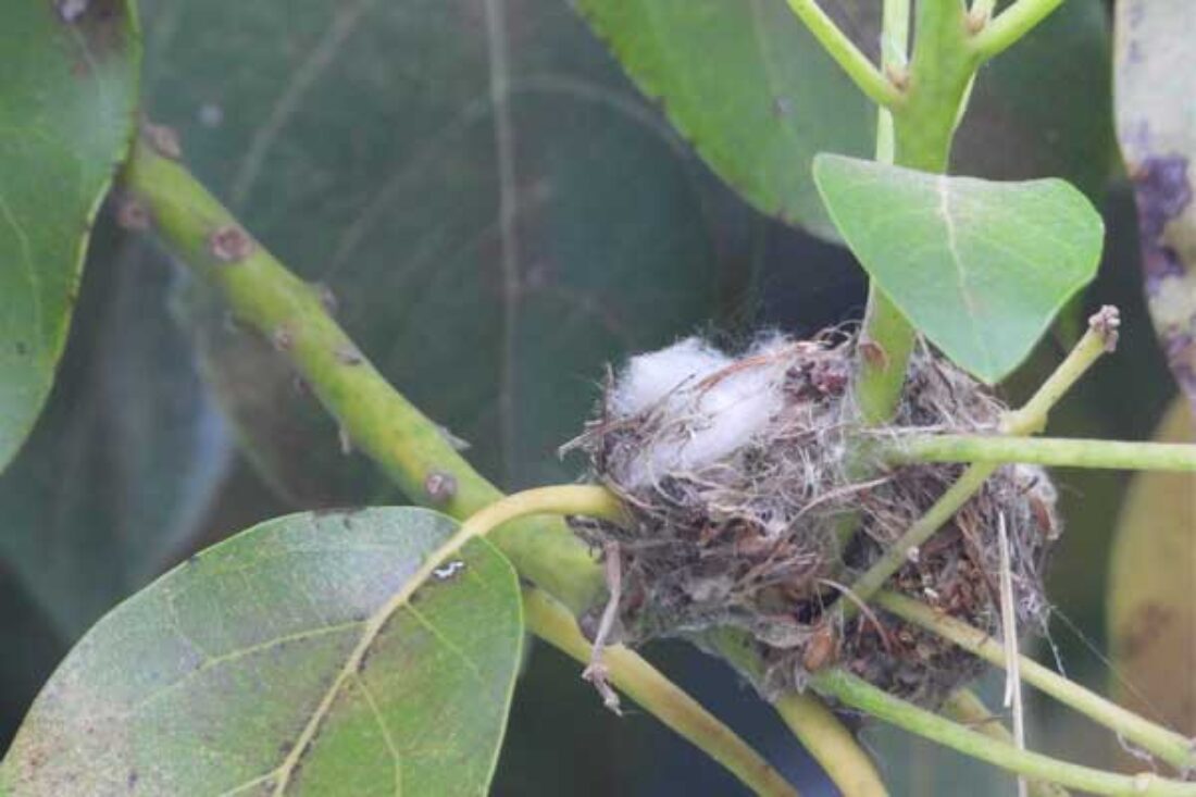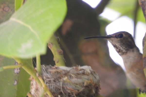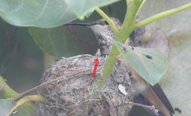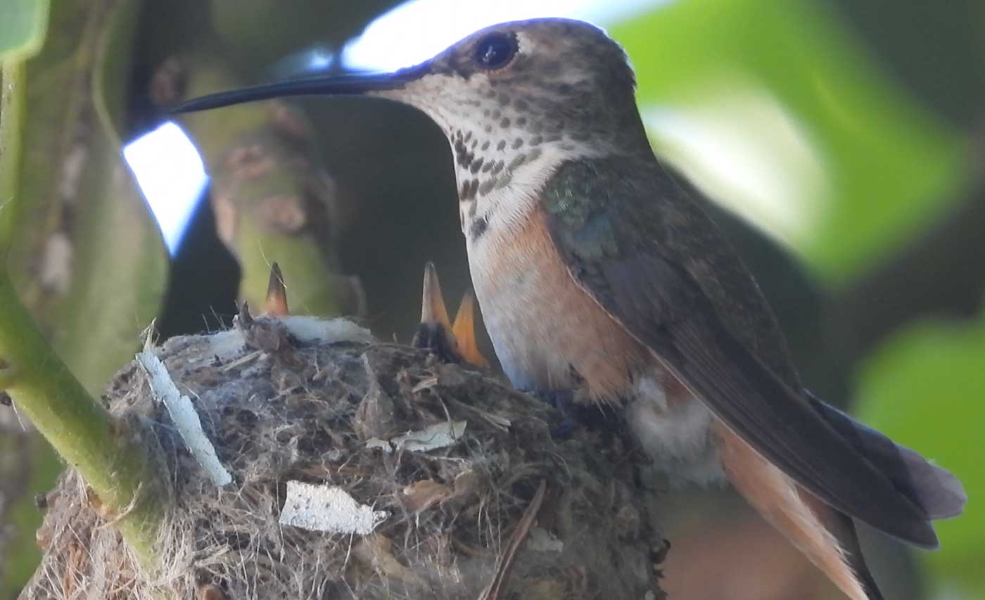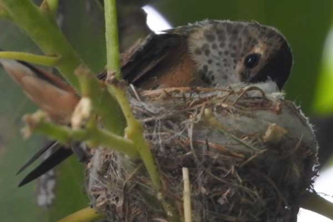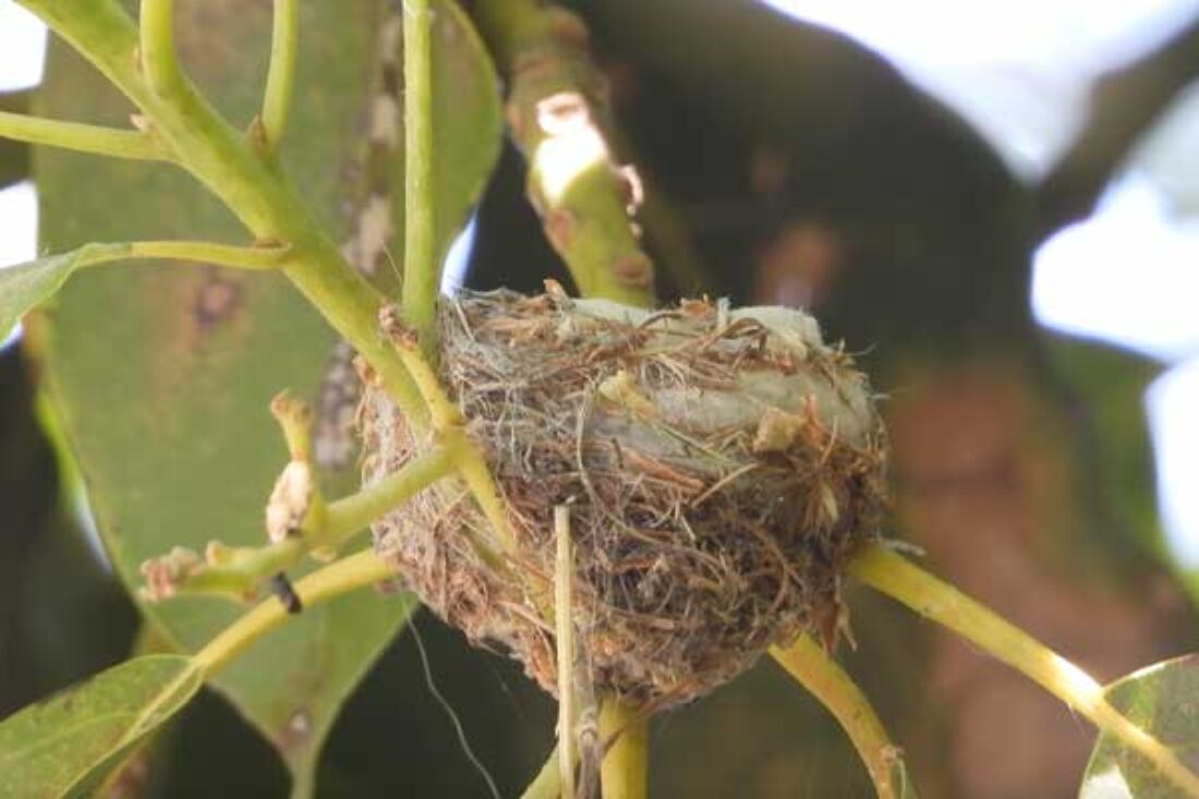 She’s come back to the same tree now for the third time this year. Today (June 1st)she is feeding her two newborns which are a day old. Their beaks are still white and they’re hairless. She successfully raised two fledglings that live near by and frequent the nectar here.