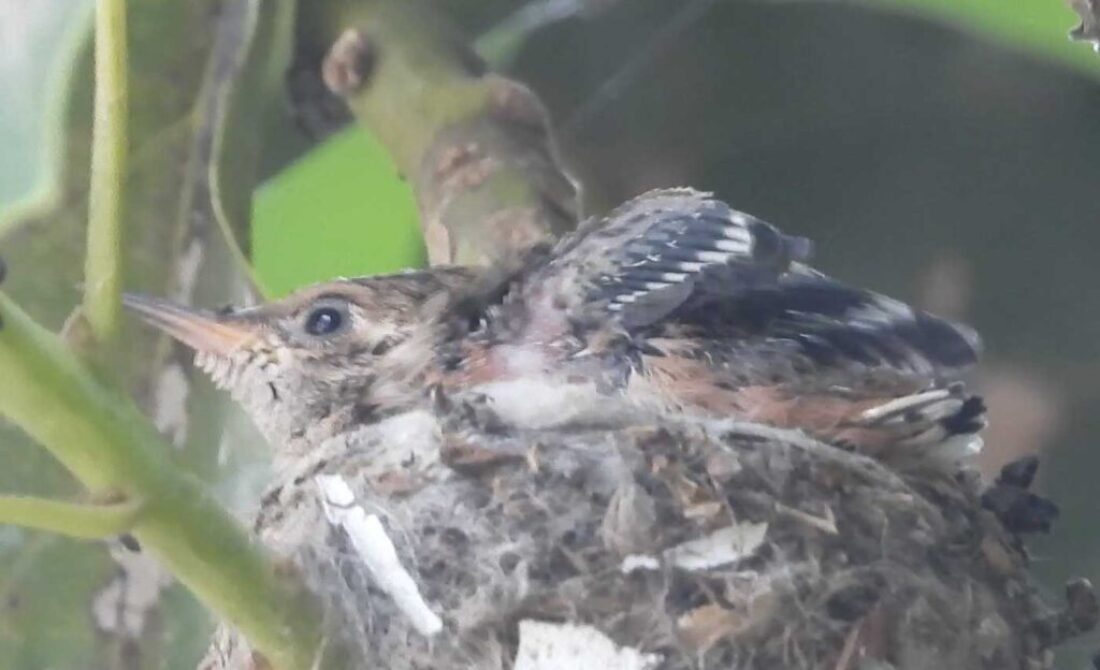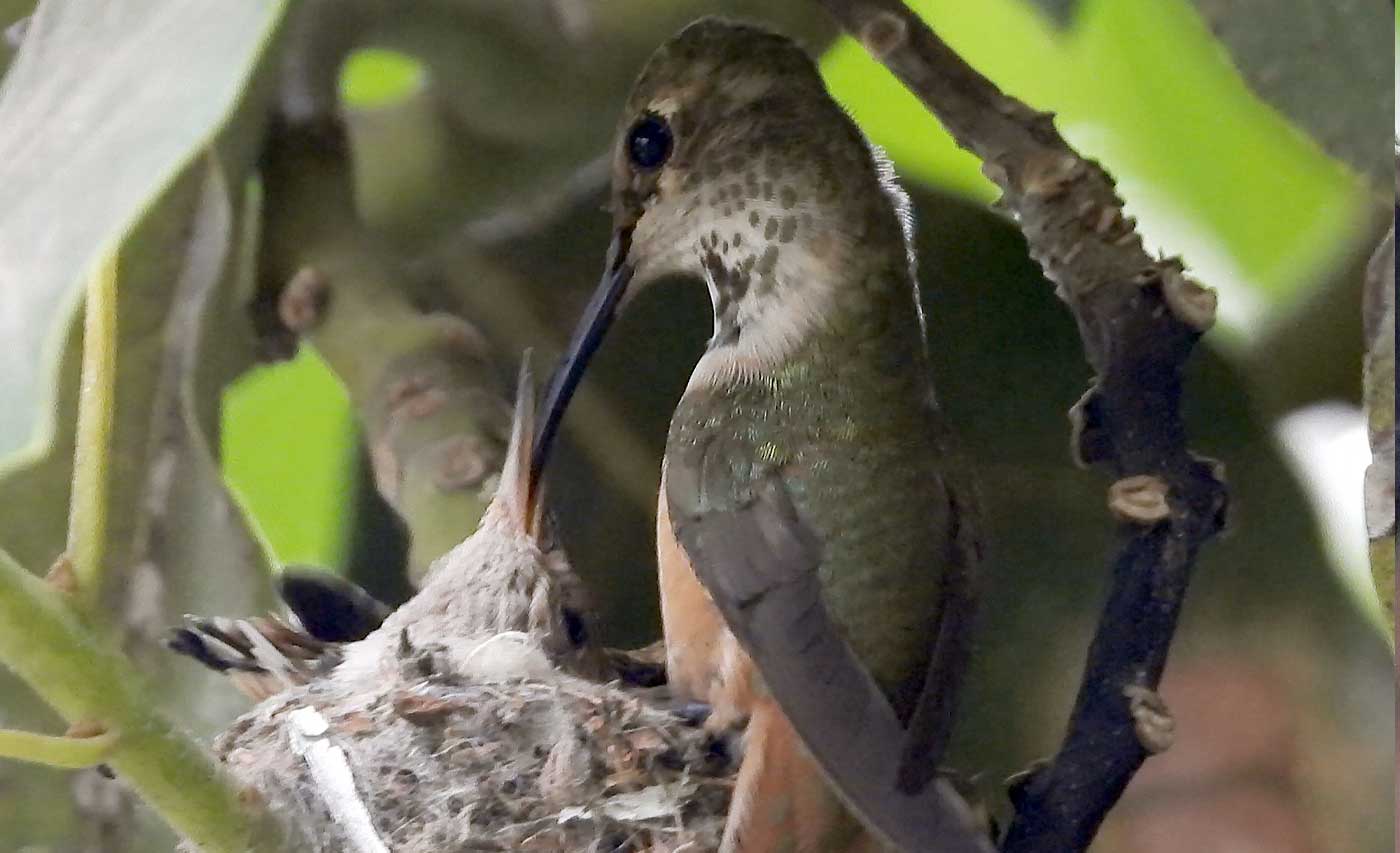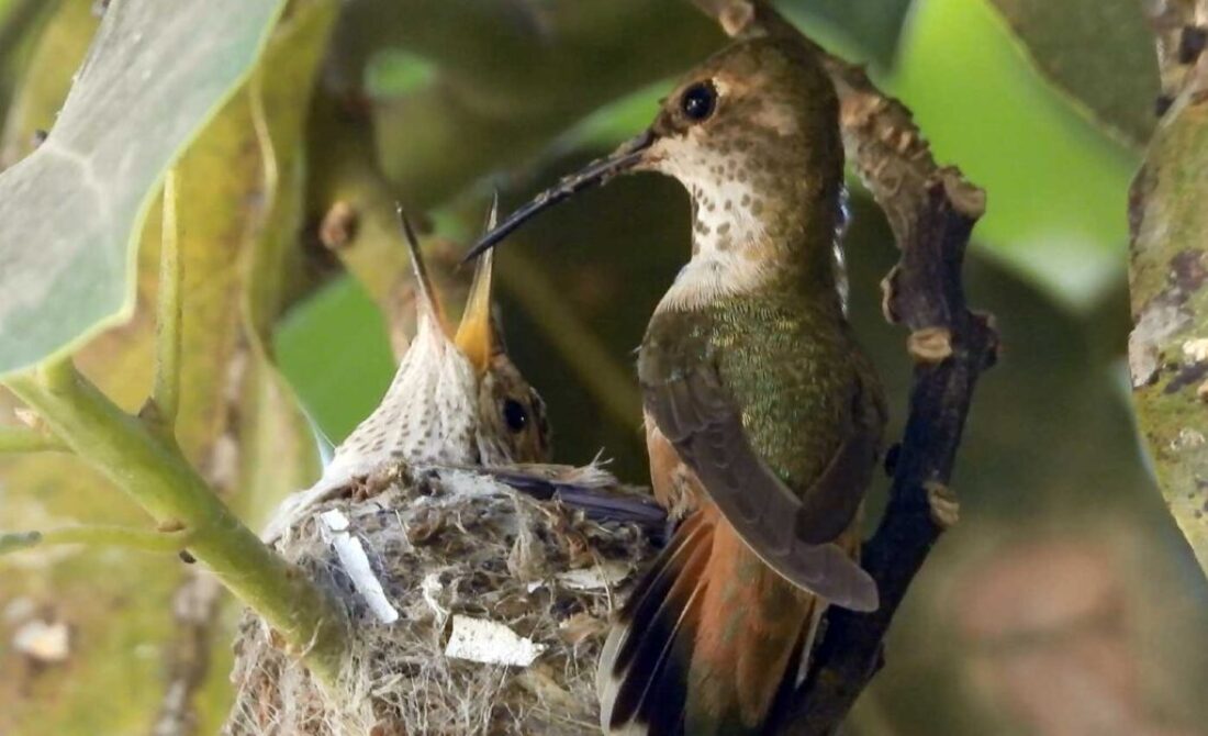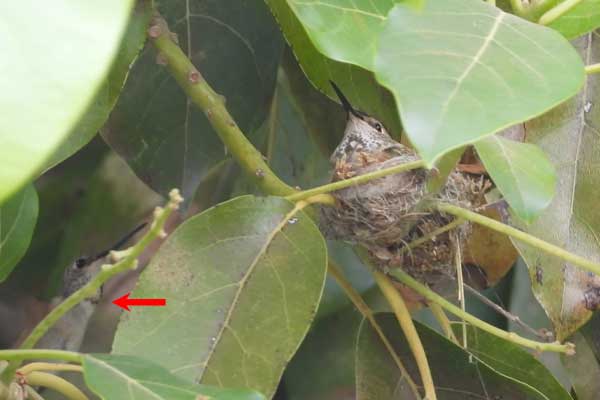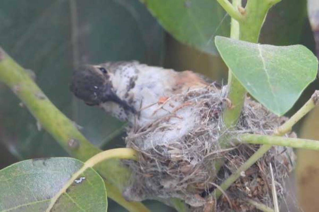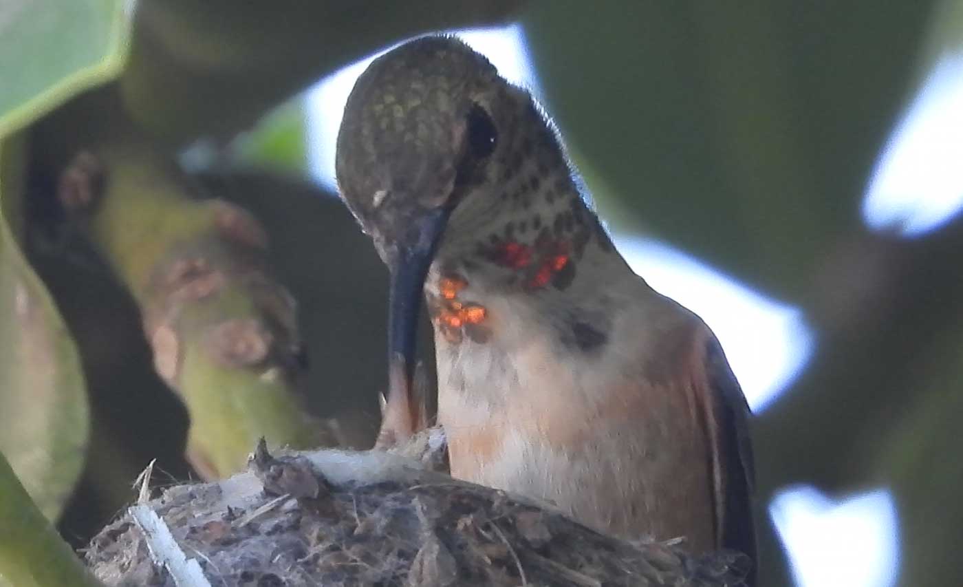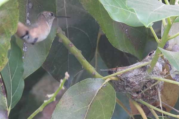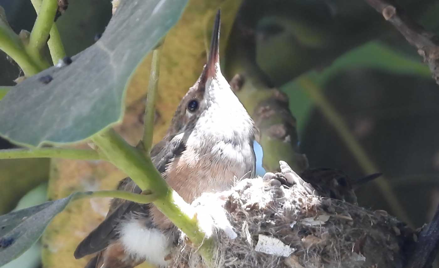 She’s come back to the same tree now for the third time this year. Today (June 1st)she is feeding her two newborns which are a day old. Their beaks are still white and they’re hairless. She successfully raised two fledglings that live near by and frequent the nectar here.