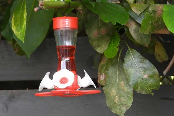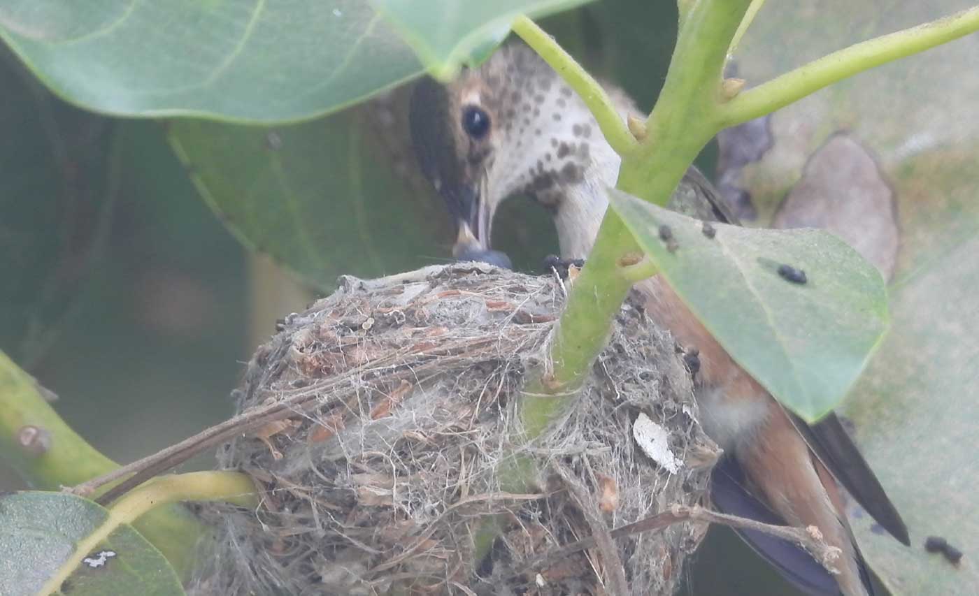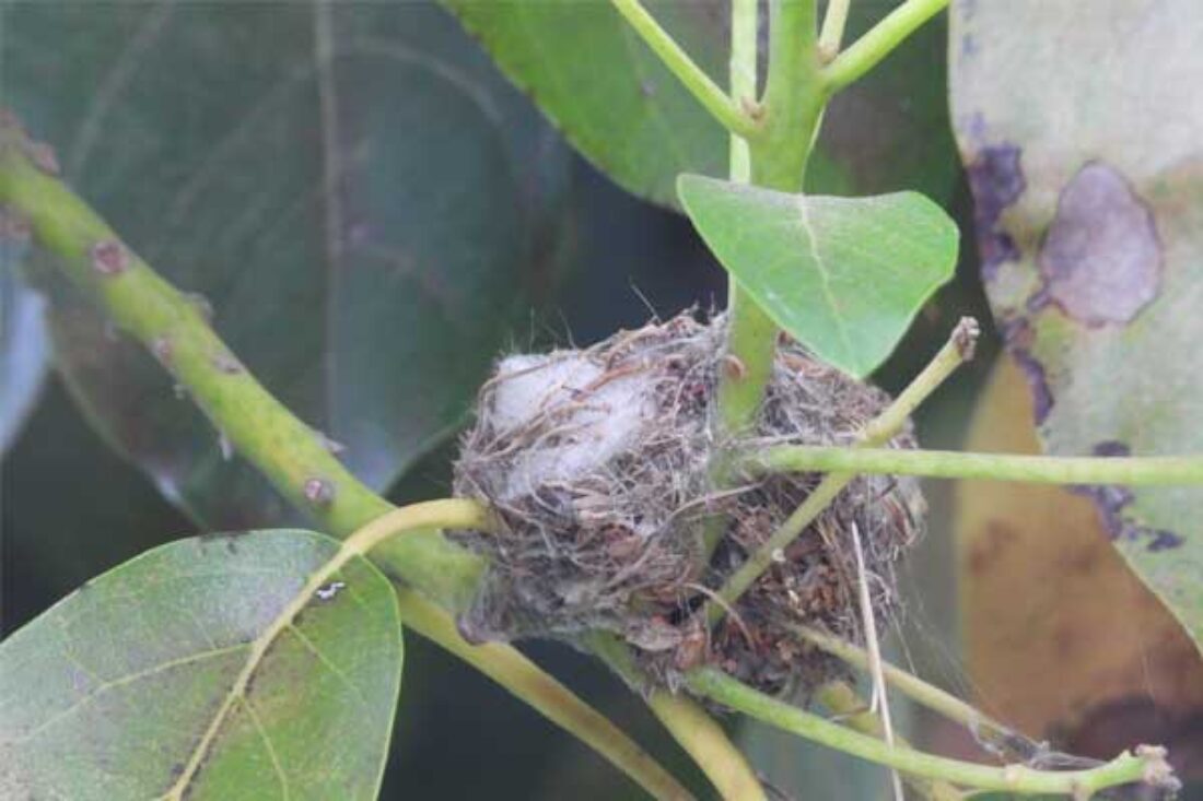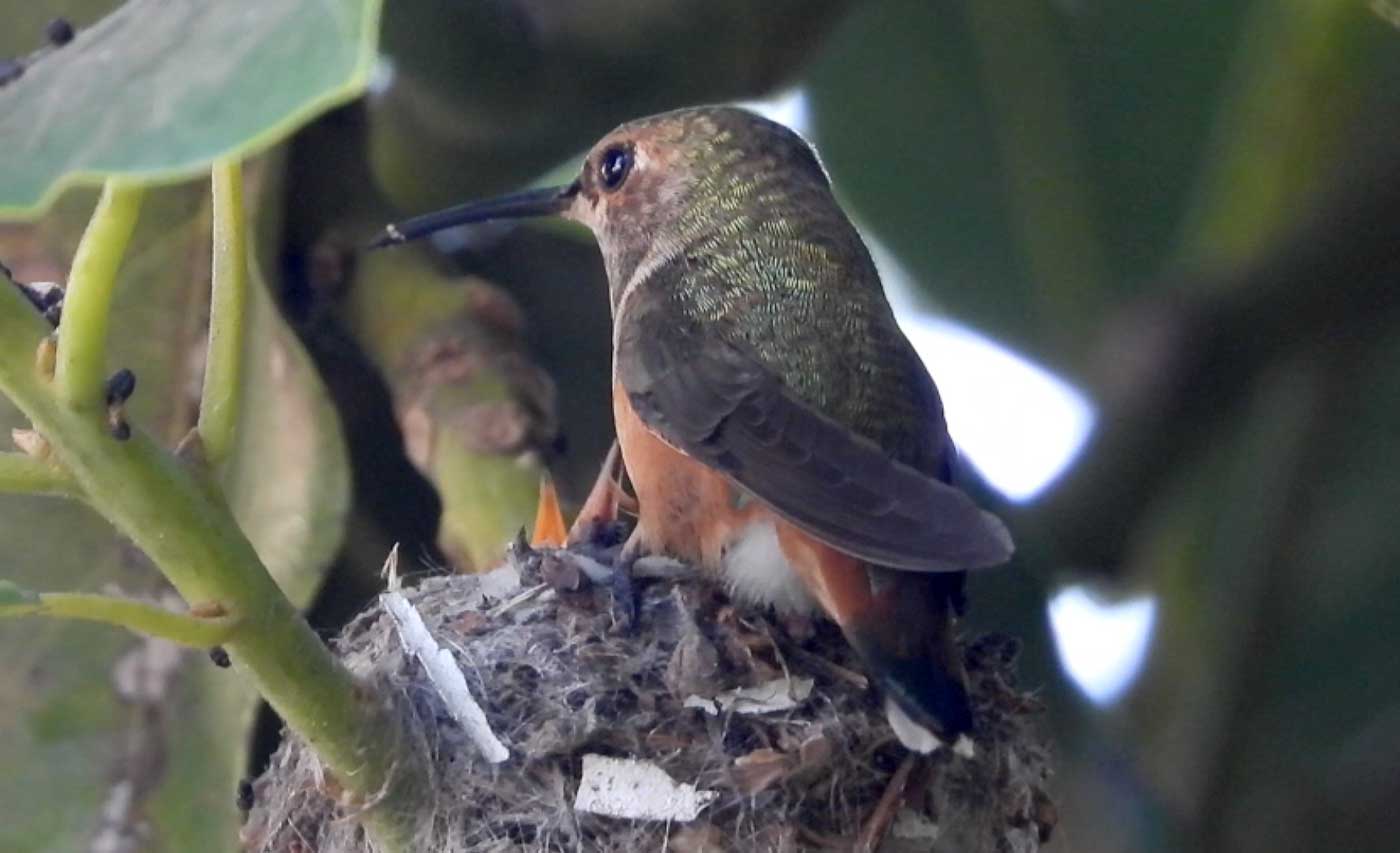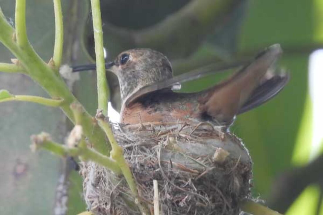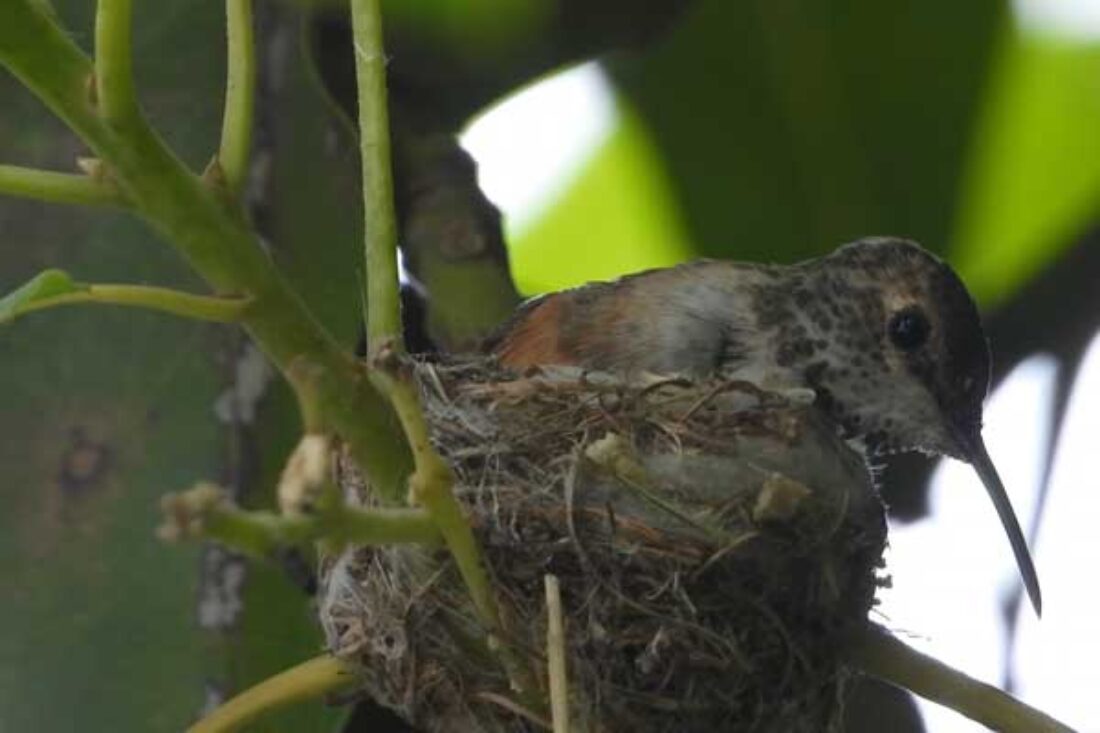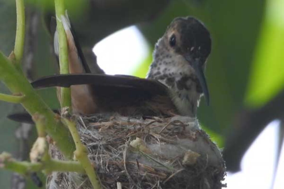 She’s come back to the same tree now for the third time this year. Today (June 1st)she is feeding her two newborns which are a day old. Their beaks are still white and they’re hairless. She successfully raised two fledglings that live near by and frequent the nectar here.
