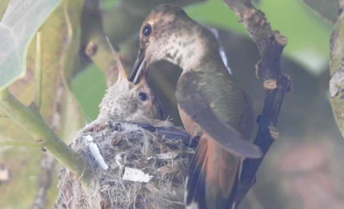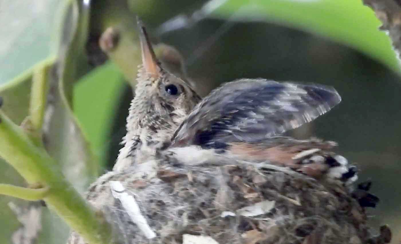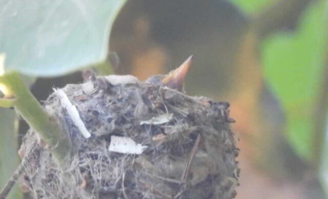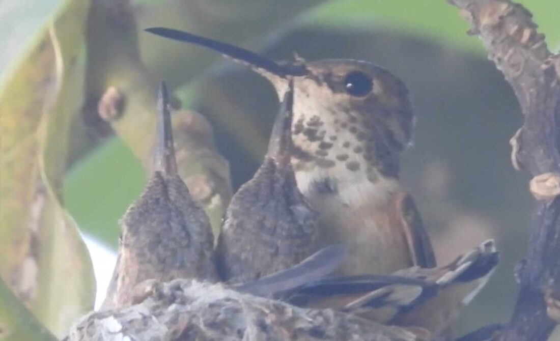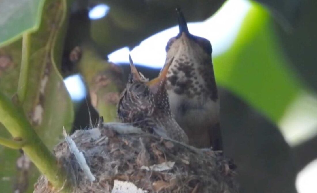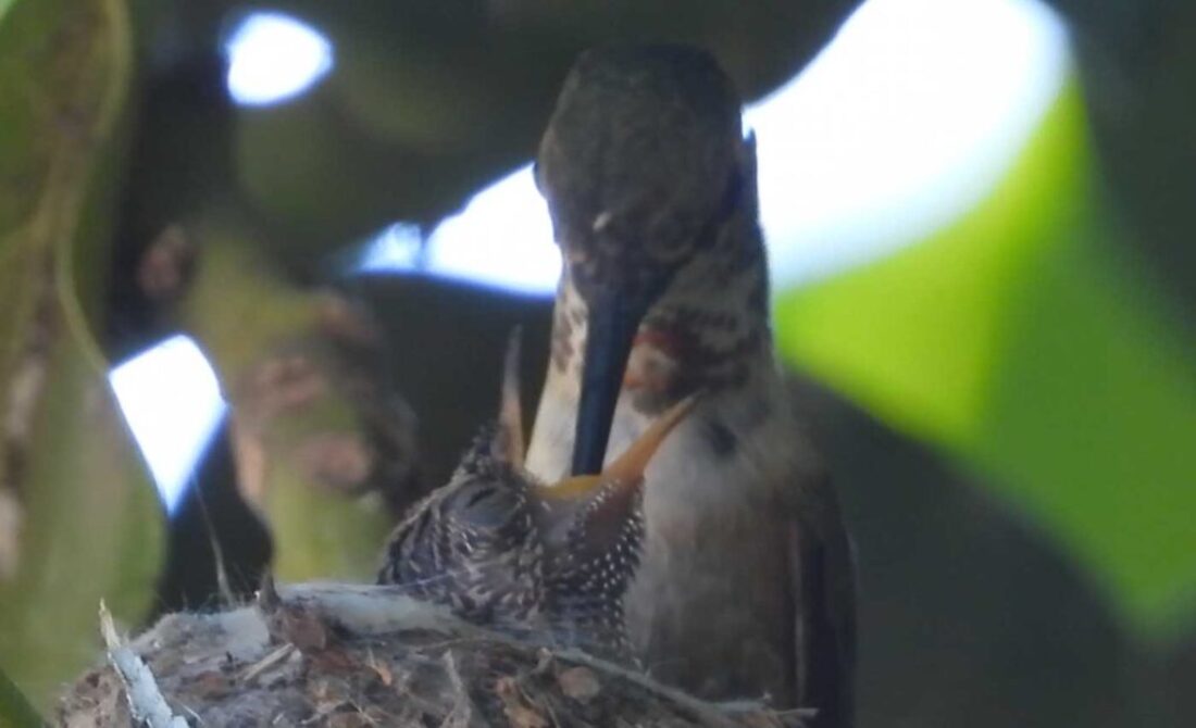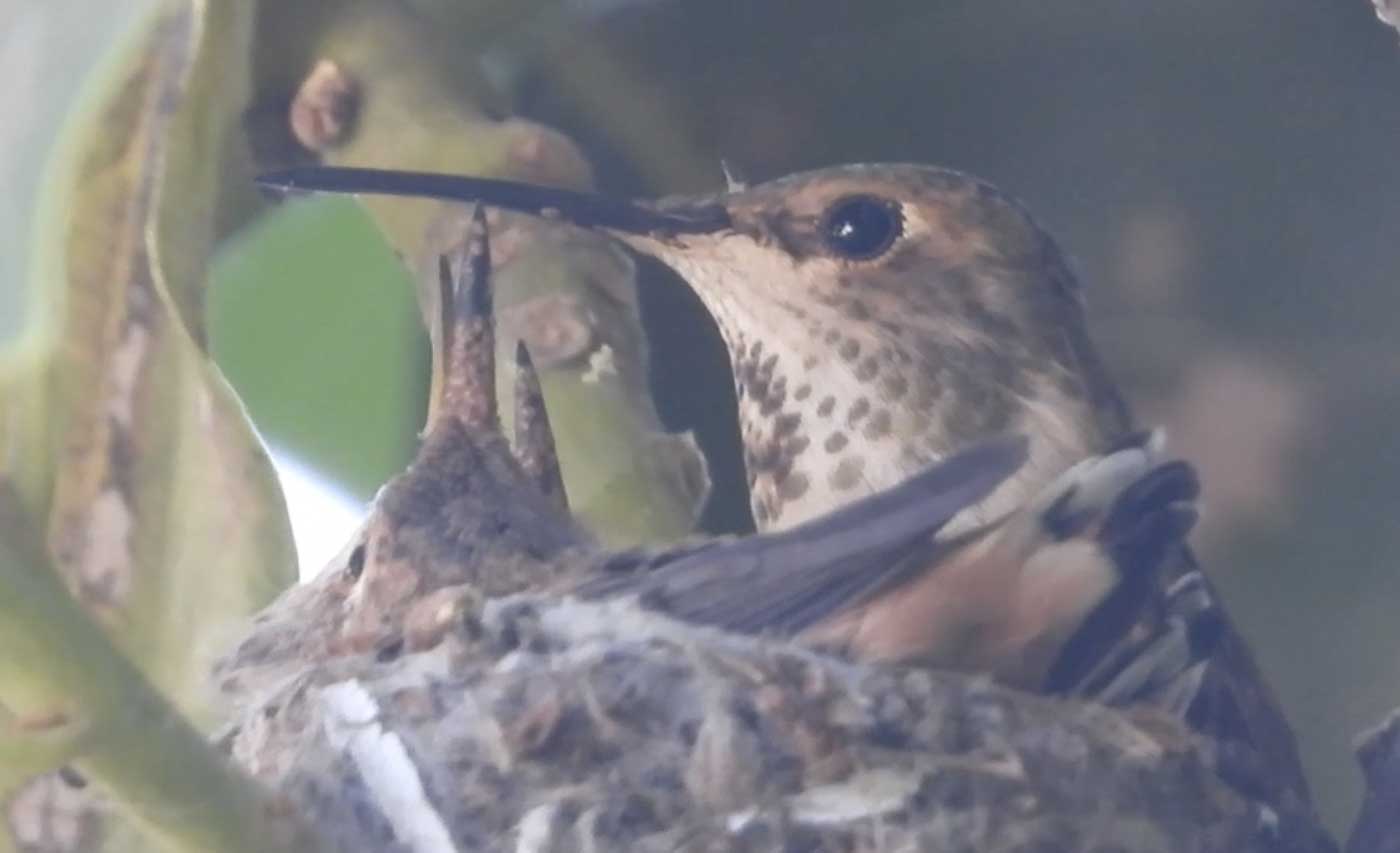 I filmed the mom hummingbird feeding her two babies. We can see the beaks, and the eyes are closed. It’s been 6 days, and in the past by day 10 the eyes open. I’ll keep watch.