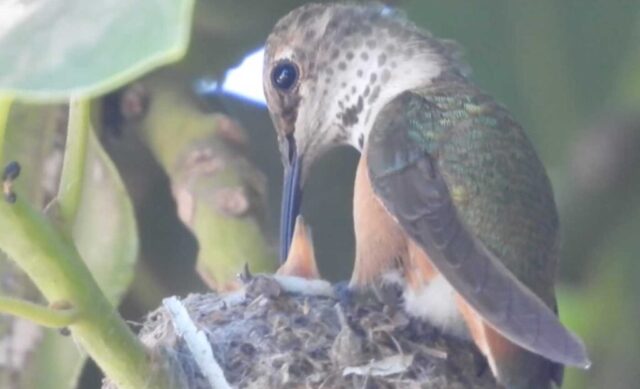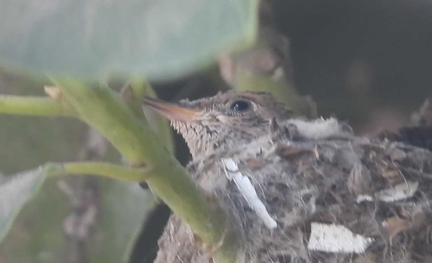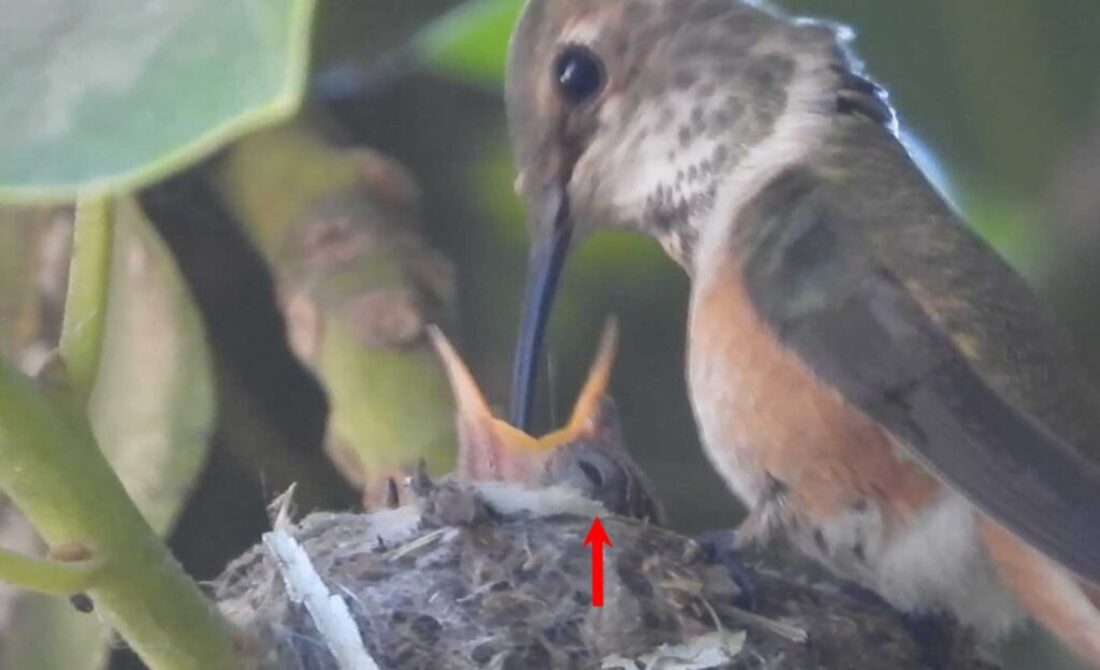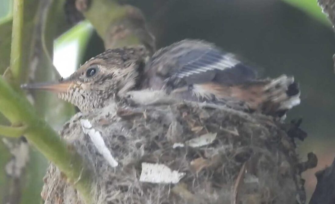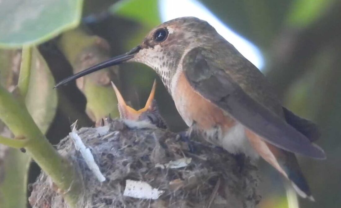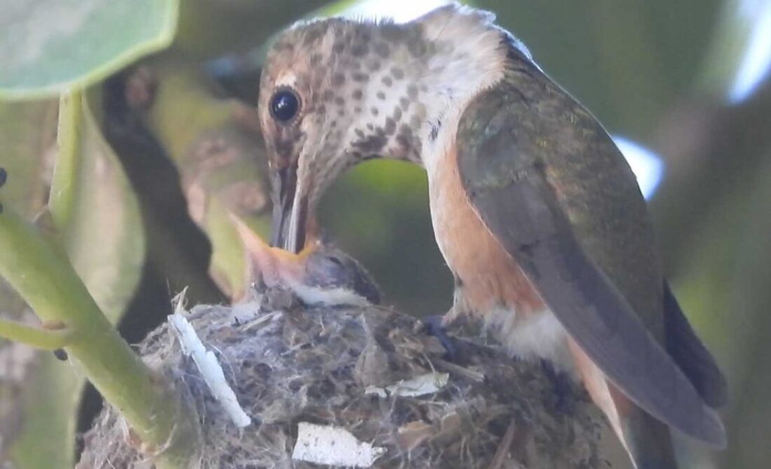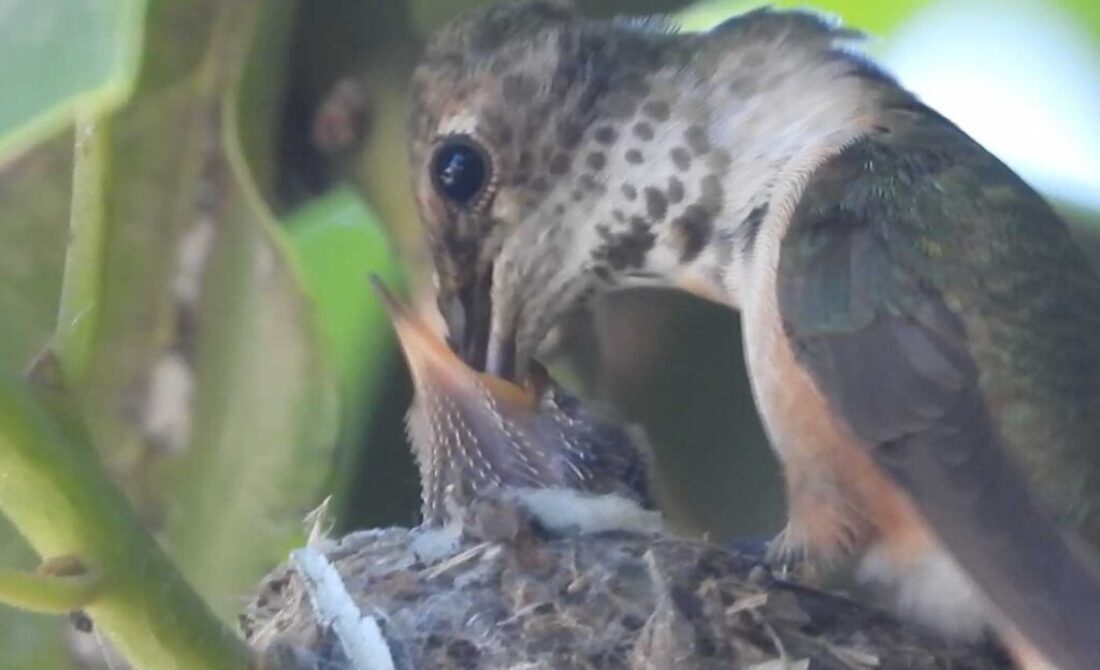 I filmed the mom hummingbird feeding her two babies. We can see the beaks, and the eyes are closed. It’s been 6 days, and in the past by day 10 the eyes open. I’ll keep watch.
