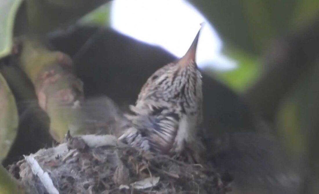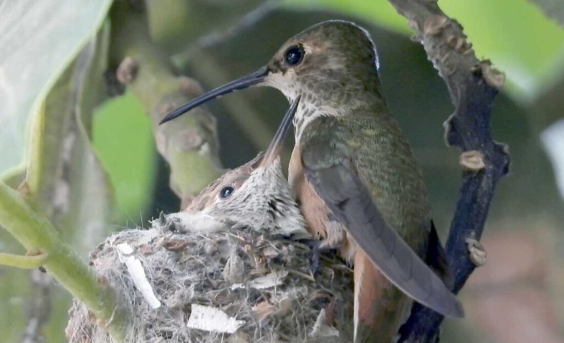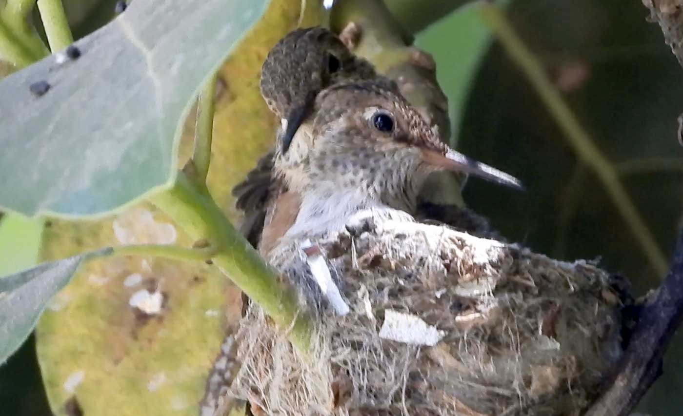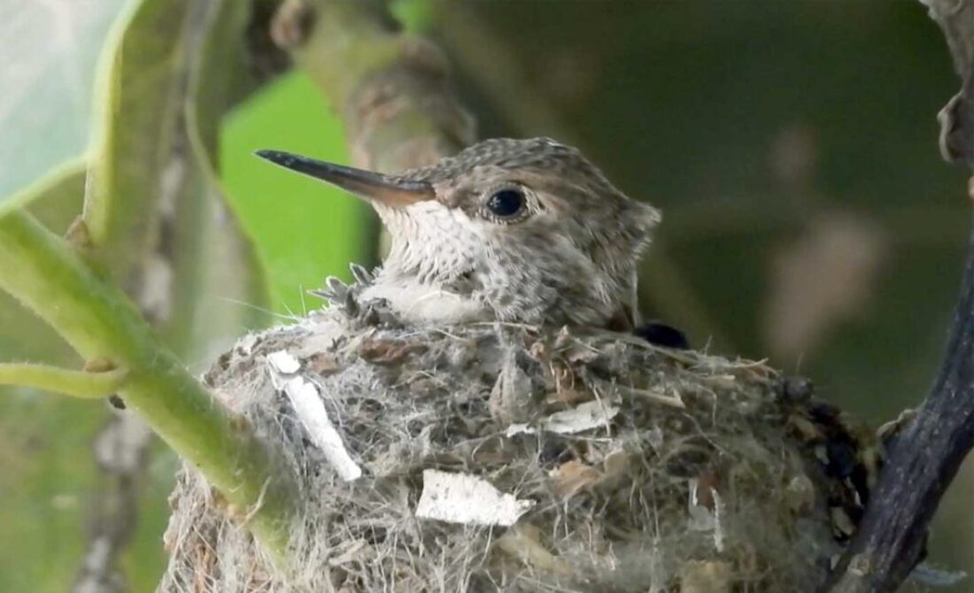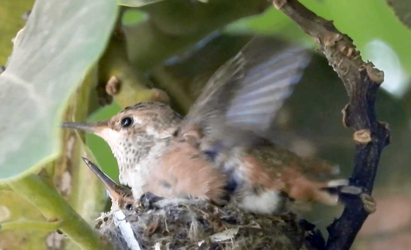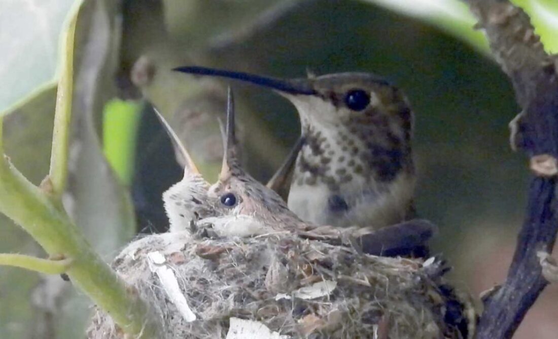 I filmed the mom hummingbird feeding her two babies. We can see the beaks, and the eyes are closed. It’s been 6 days, and in the past by day 10 the eyes open. I’ll keep watch.