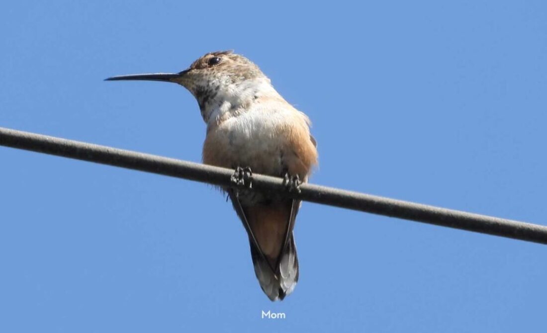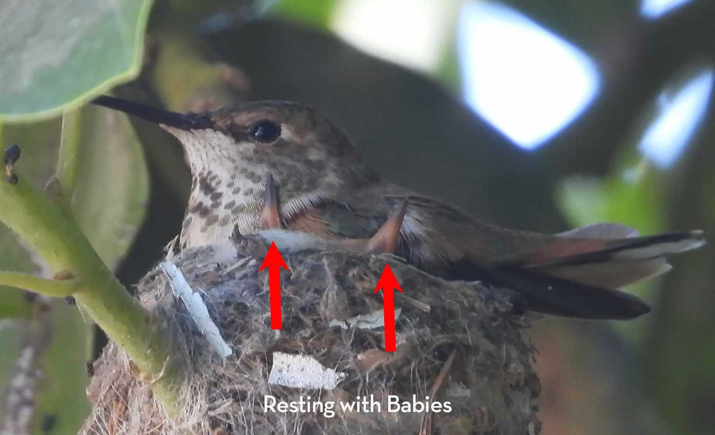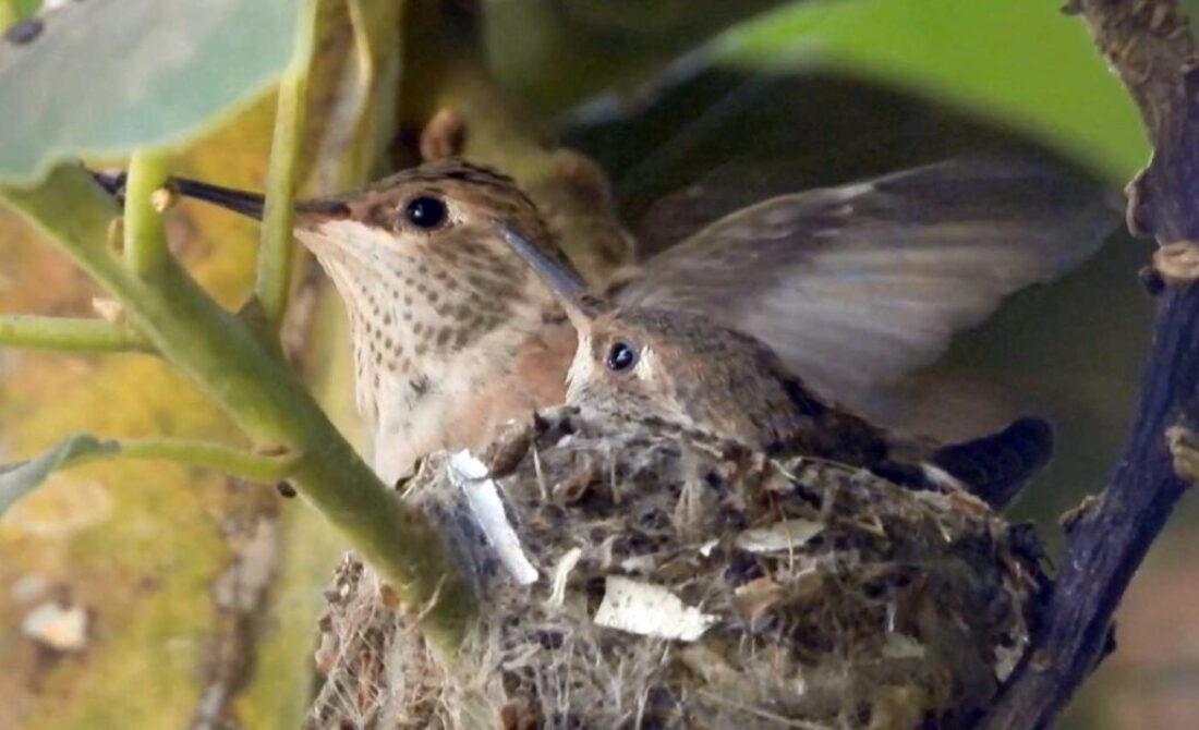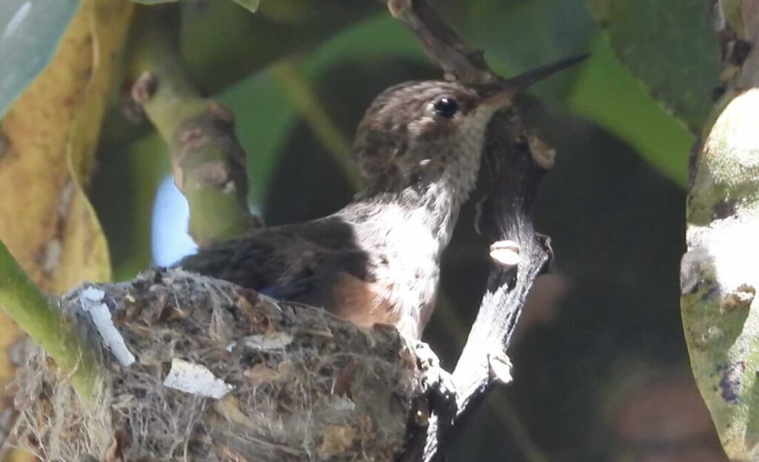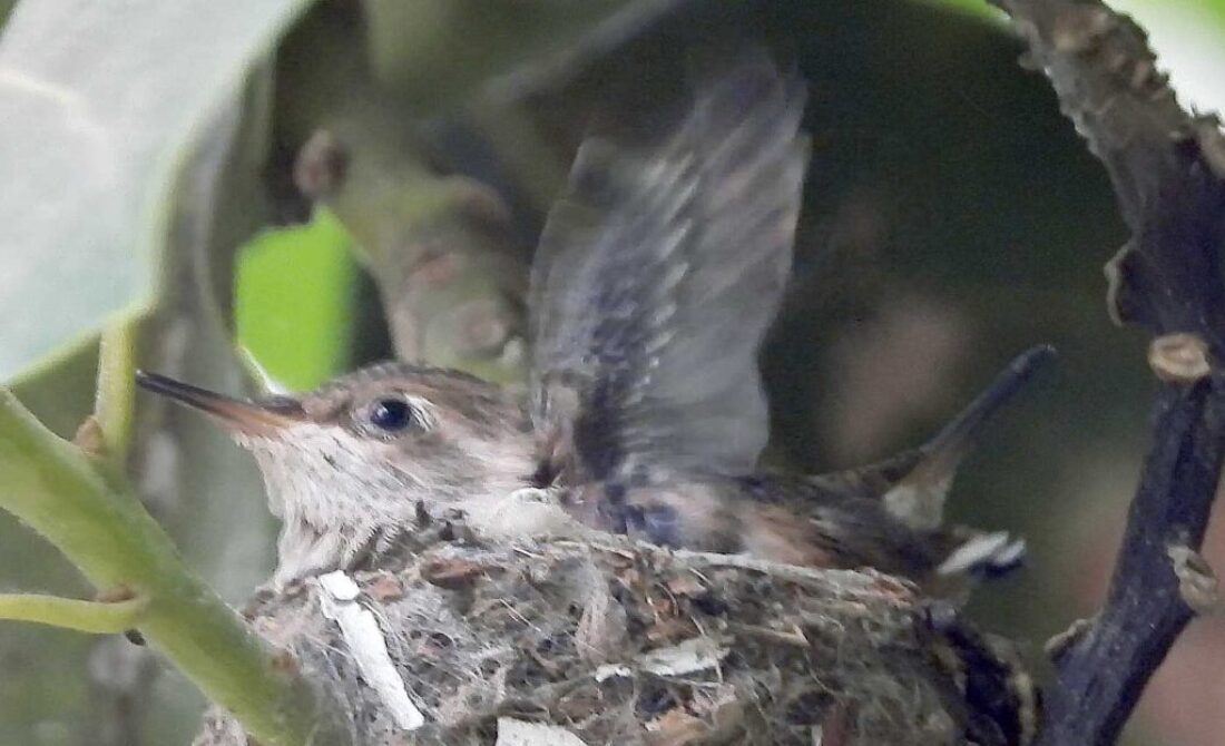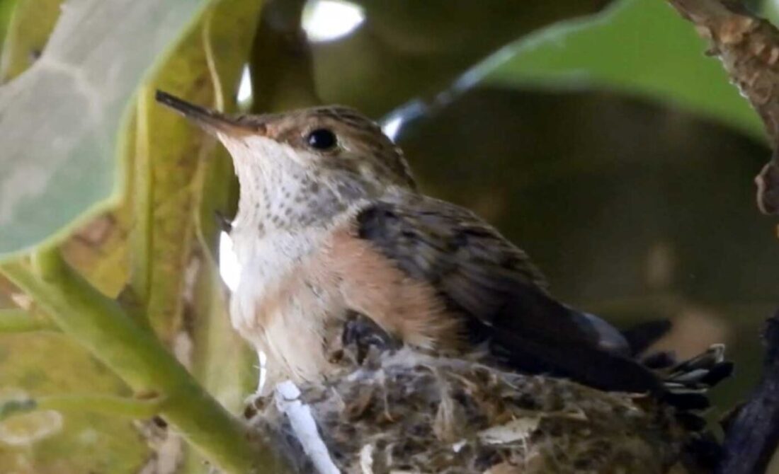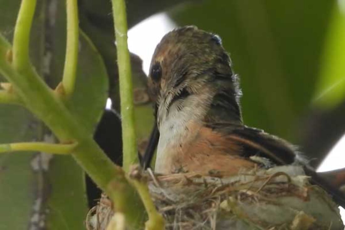 I filmed the mom hummingbird feeding her two babies. We can see the beaks, and the eyes are closed. It’s been 6 days, and in the past by day 10 the eyes open. I’ll keep watch.