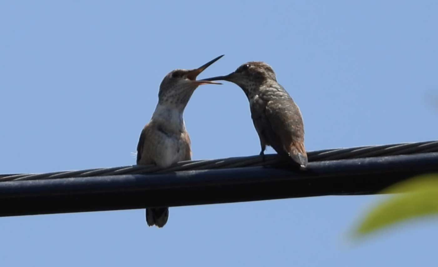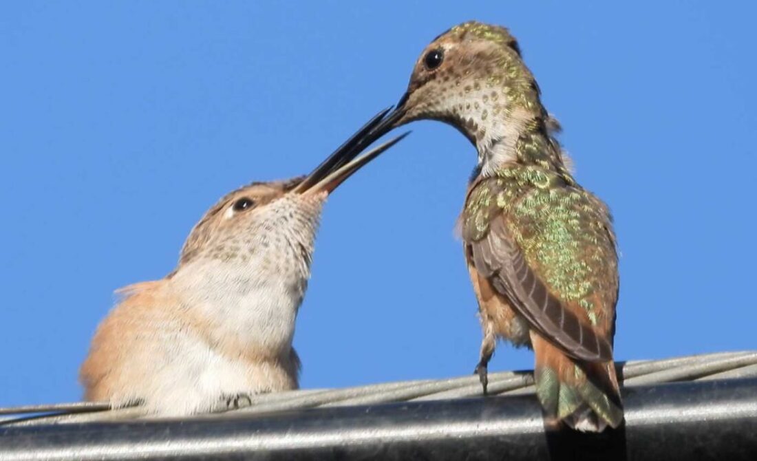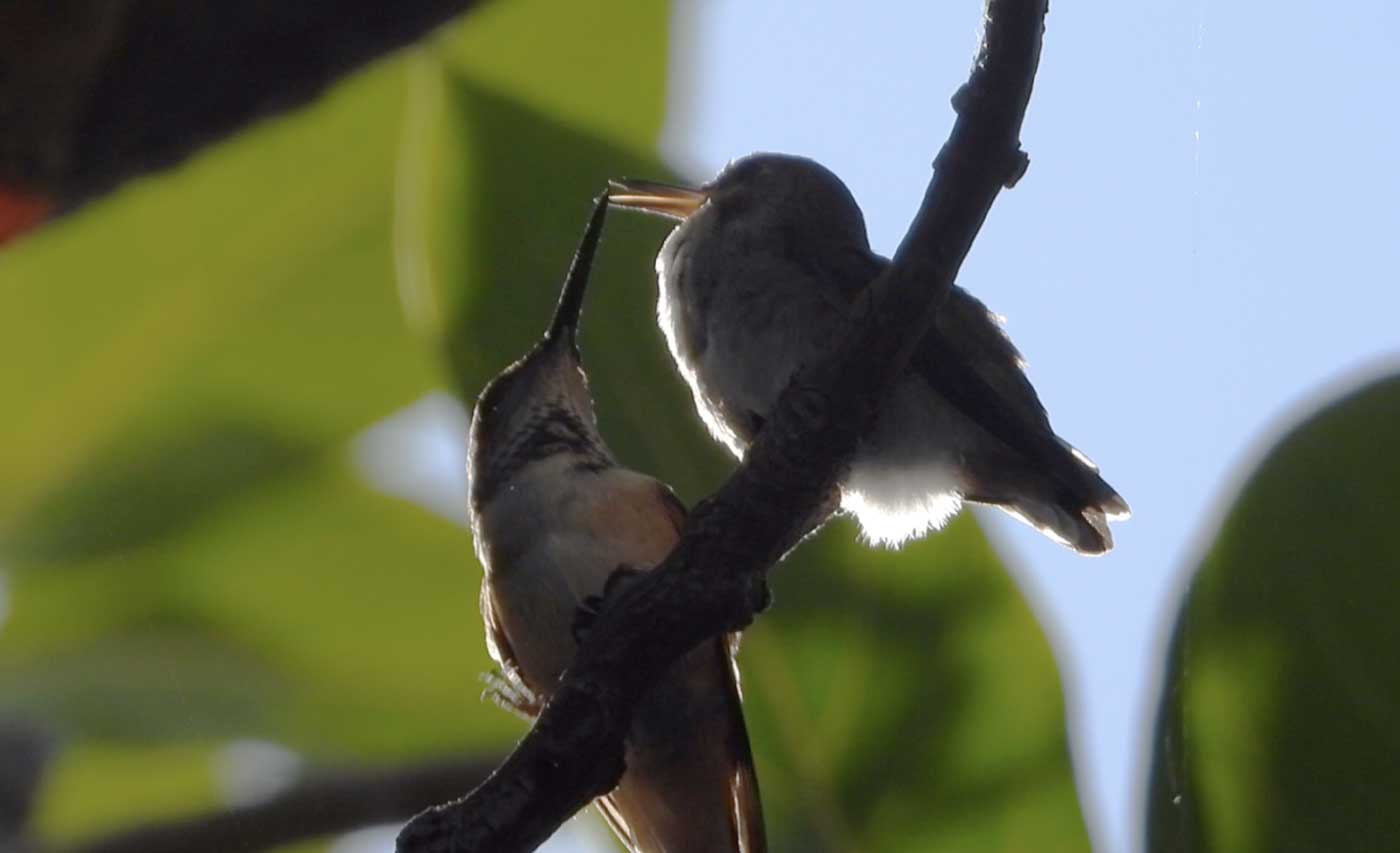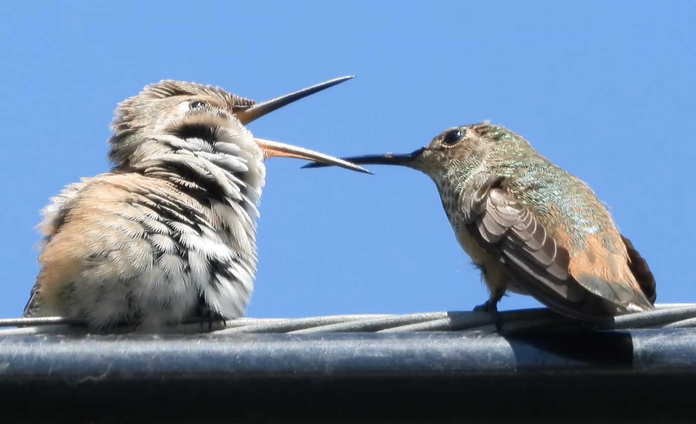 (Mom hummingbird feeding her fledgling)