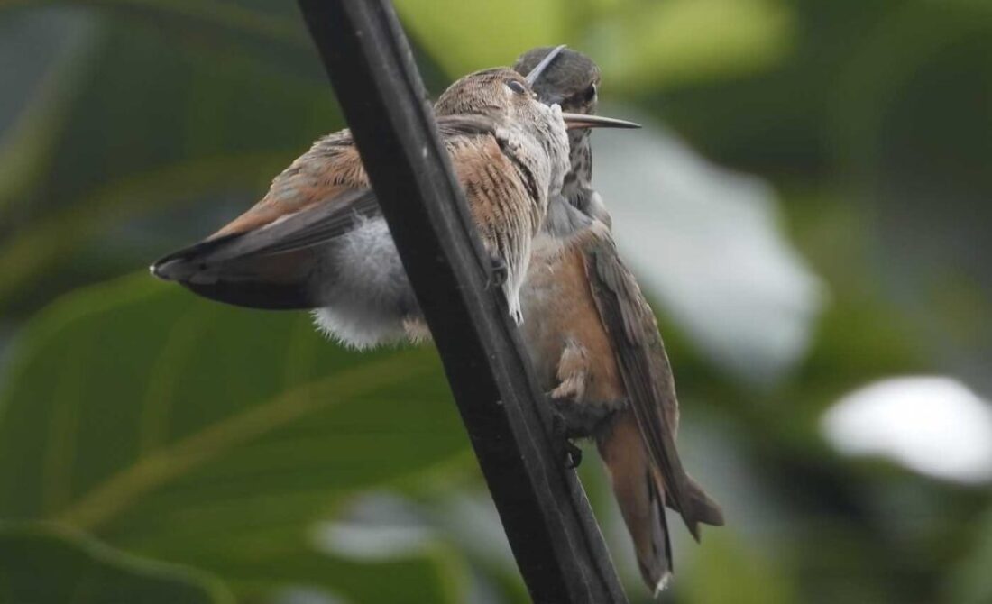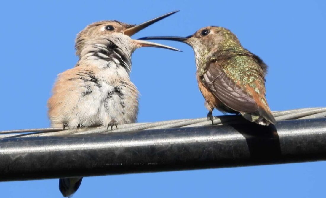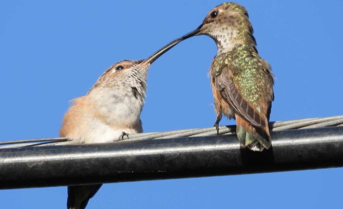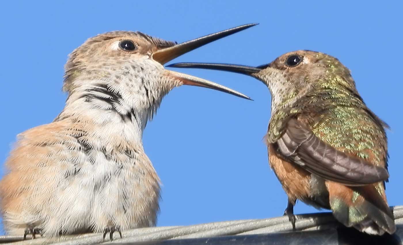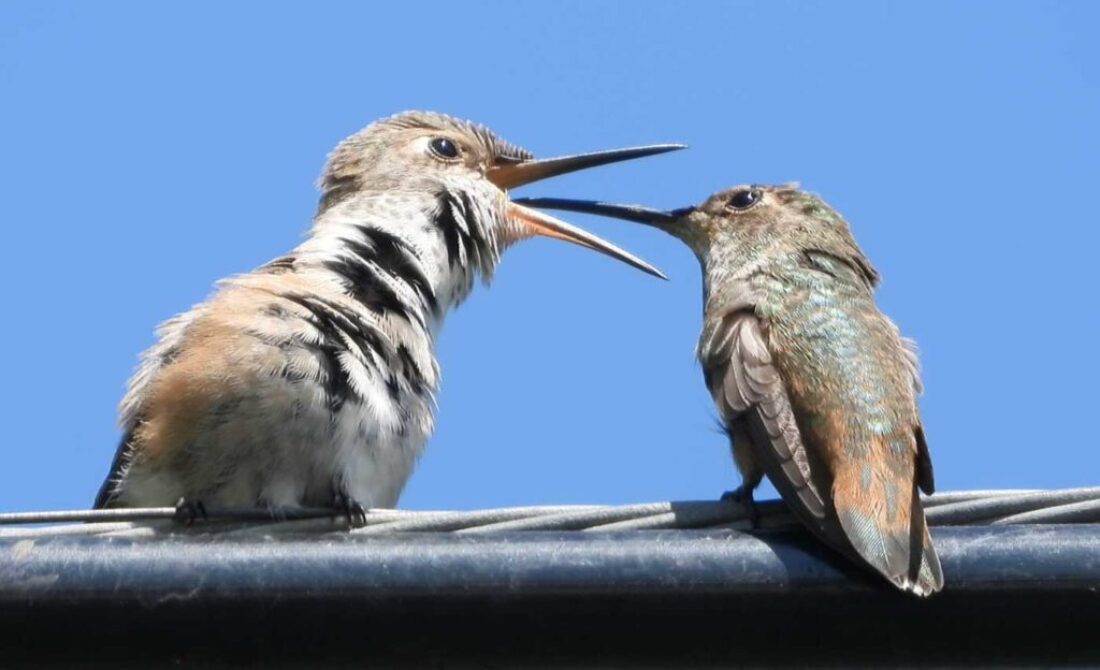 (Mom hummingbird feeding her fledgling)