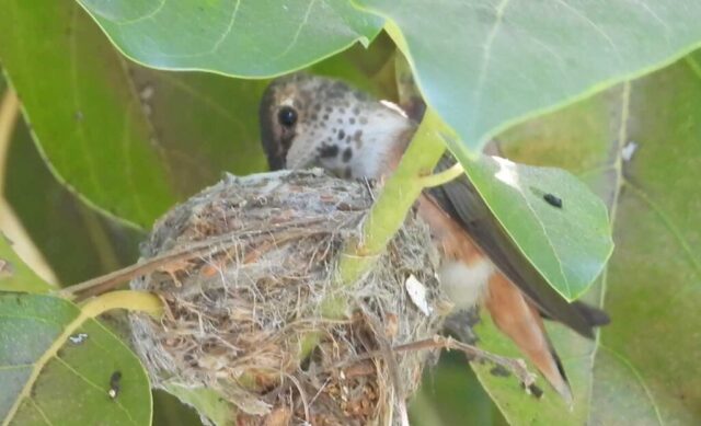 May 15, 2021, Day 10, She can be seen moving quickly up and down generating heat to incubate the egg. Today a family of squirrels came into the avocado tree and all around her nest. When they left she flew into every area they had been like she knew their track and when they left. There are beautiful orbs flying around the nest as well. Heaven has been keeping watch. Her mate is with her. He can be seen in some videos visiting her a few times and is close by keeping watch. She stays in the nest for most of the hour but will leave to bath, and get food but only for a few minutes.